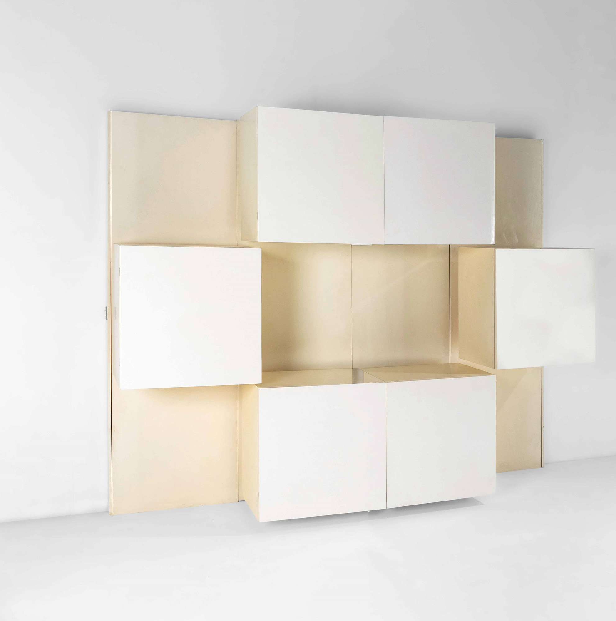 Struttura, sei mobili contenitori a quattro campate in legno laccato, dettagli in plexiglas di forte spessore., Prod. Acerbis, Italia, 1970, Misura campata cm 71x60x220; , misura singolo modulo cm 70x42x70