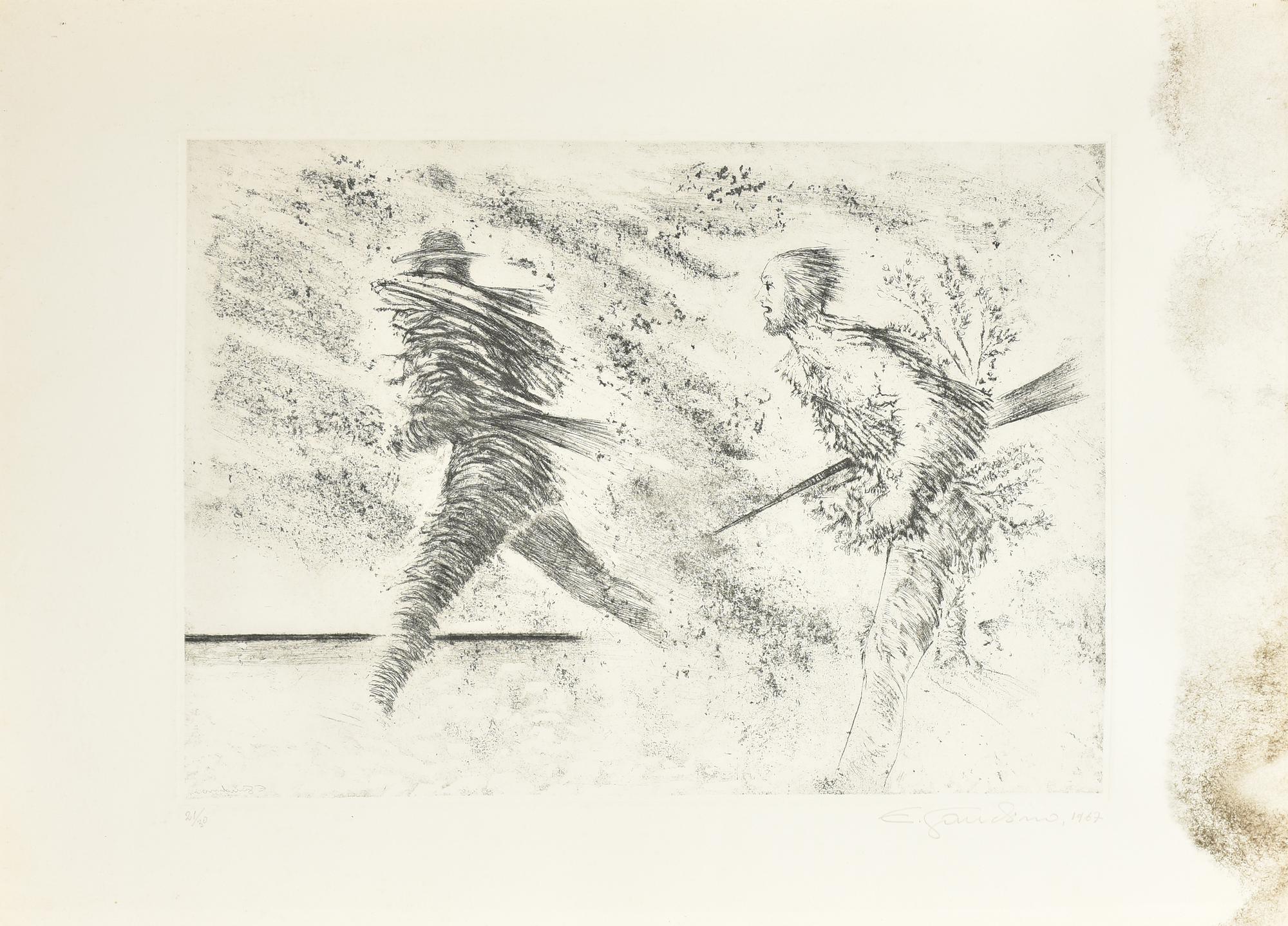 Enrico Gaudino CACCIATORI incisione su carta, battuta cm 33,5x49, su foglio...