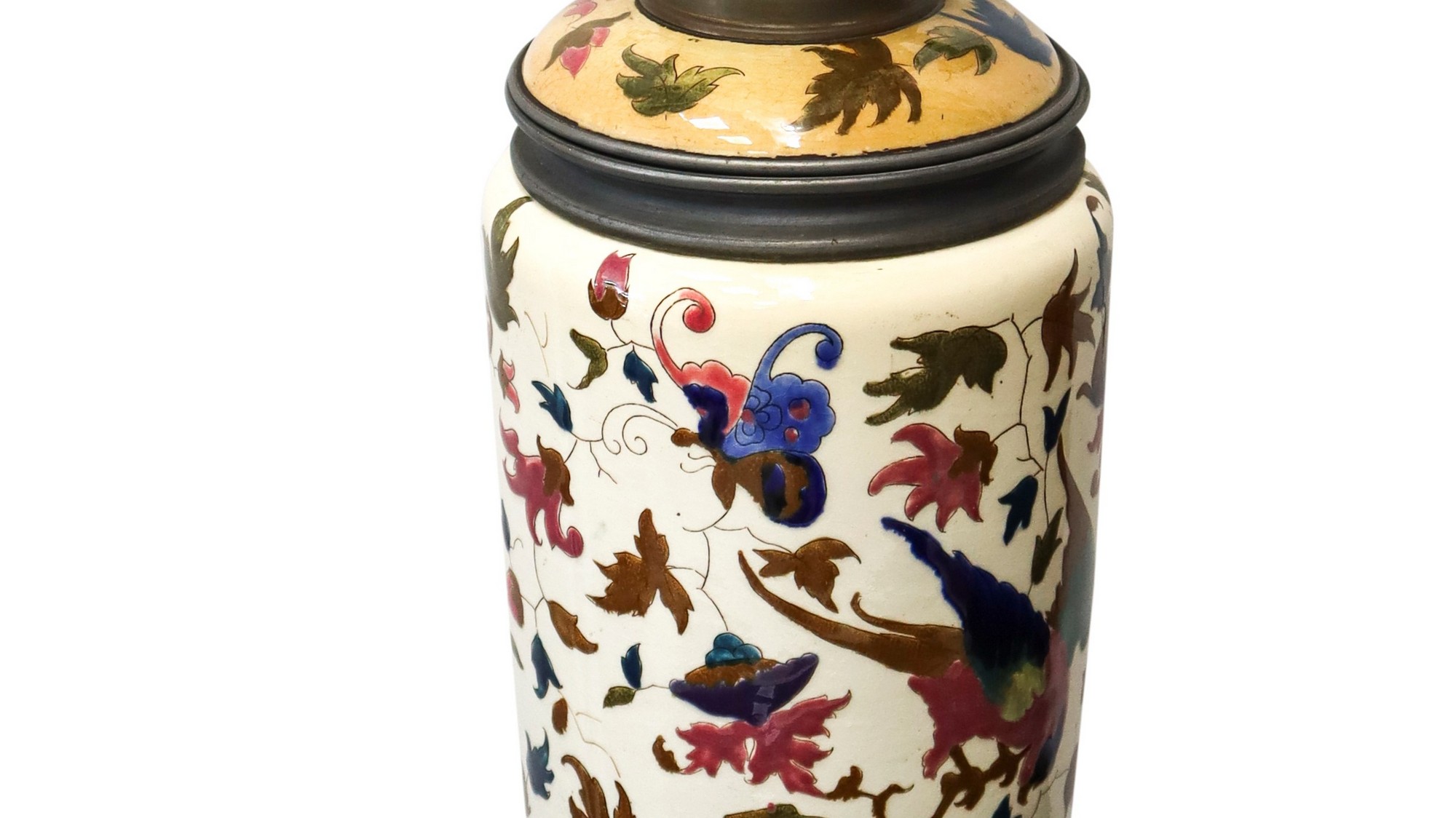 Dipinta con foglie, uccelli e farfalle.