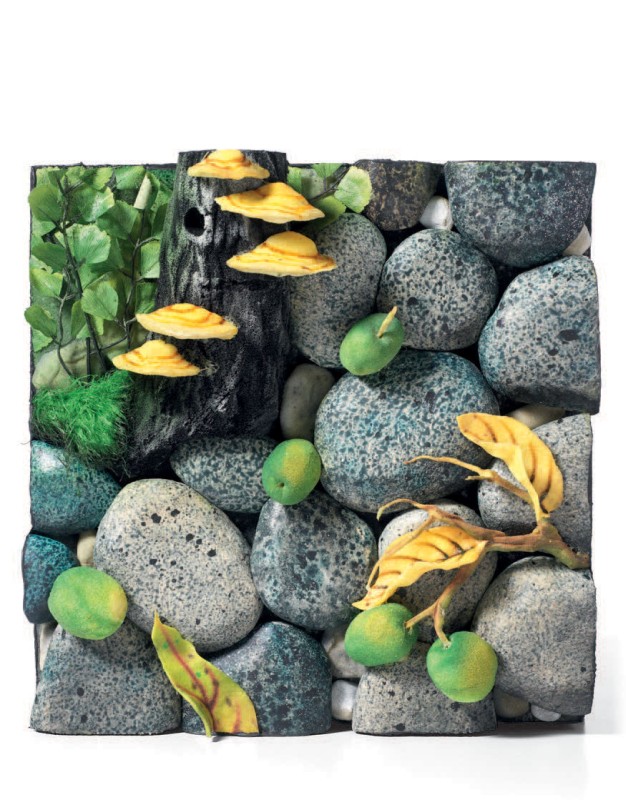 Piero Gilardi Torino 1942 Funghi e noci sul greto Poliuretano espanso dipinto, in teca di plexiglass, cm. 31x31x15,5 (teca) Titolo e firma al verso: "Funghi e noci sul greto" / Gilardi. Foto autenticata dall'artista.