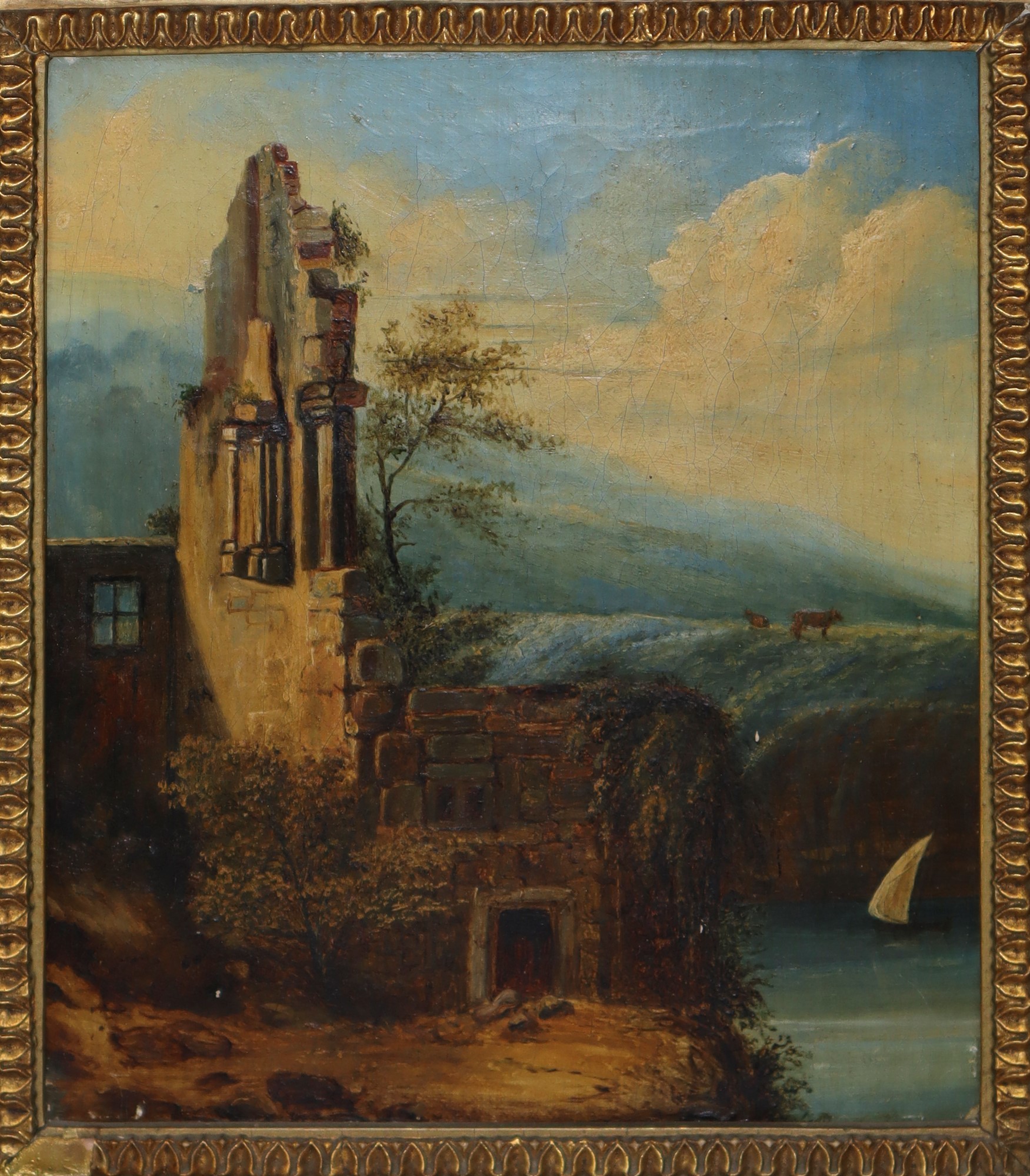 Paesaggio fluviale con rovine architettoniche cm 24 x cm 21; in cornice cm 36 x cm 33 Olio su tela Pittore del XIX secolo.