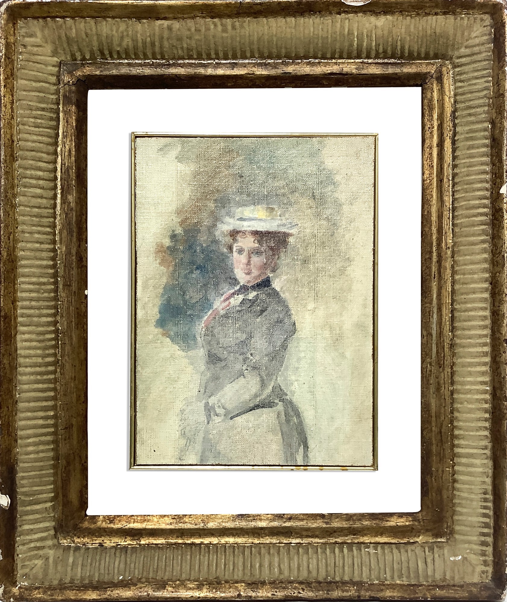 Donna con cappello, fine 19° Secolo cm 20 x cm 15, in cornice dorata cm 34 x cm 29 Dipinto ad olio su cartone telato