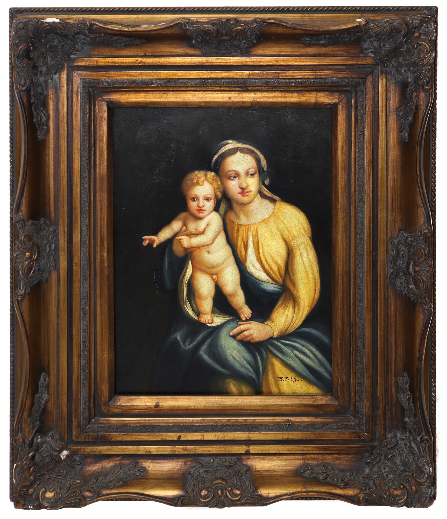 Madonna con bambino, 1939 cm 40 x cm 30, in cornice cm 66 x cm 57 Olio su tavola Bernardo Filtz, firmato in basso a destra. Con certificazione Antichità Veneziana
