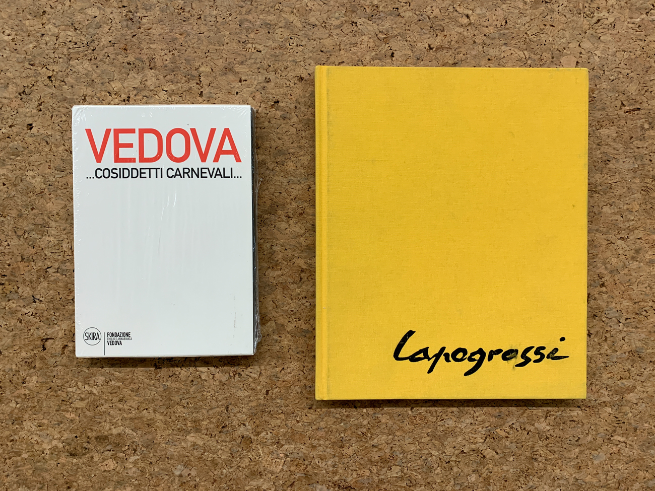 Piccolo cofanetto composto da due cataloghi riccamente illustrati: 'Emilio Vedova. 2013' e 'Emilio Vedova. ..cosidetti carnevali..', entrambi a cura di Germano Celant, editi in occasione delle esposizioni tenutesi presso Scuola Grande di San Rocco, Musei Civici di Venezia e Fondazione Emilio e Annabianca Vedova, Venezia, 2013