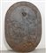 Scudo decorativo da parete. Shield, wll mounted, cast iron. ghisa. Cm 49x68. Rilievo con scene mitologiche, pesa circa 15 Kg. Difetti. Decorations in relief. Weight approximately 15 Kg. Defects. 1900.