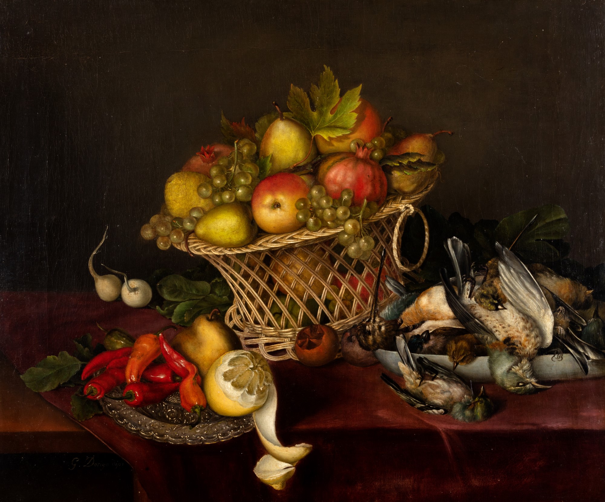 Scuola italiana prima metà del XIX secolo - Natura morta con peperoncini, limone, cesto di frutta e cacciagione
