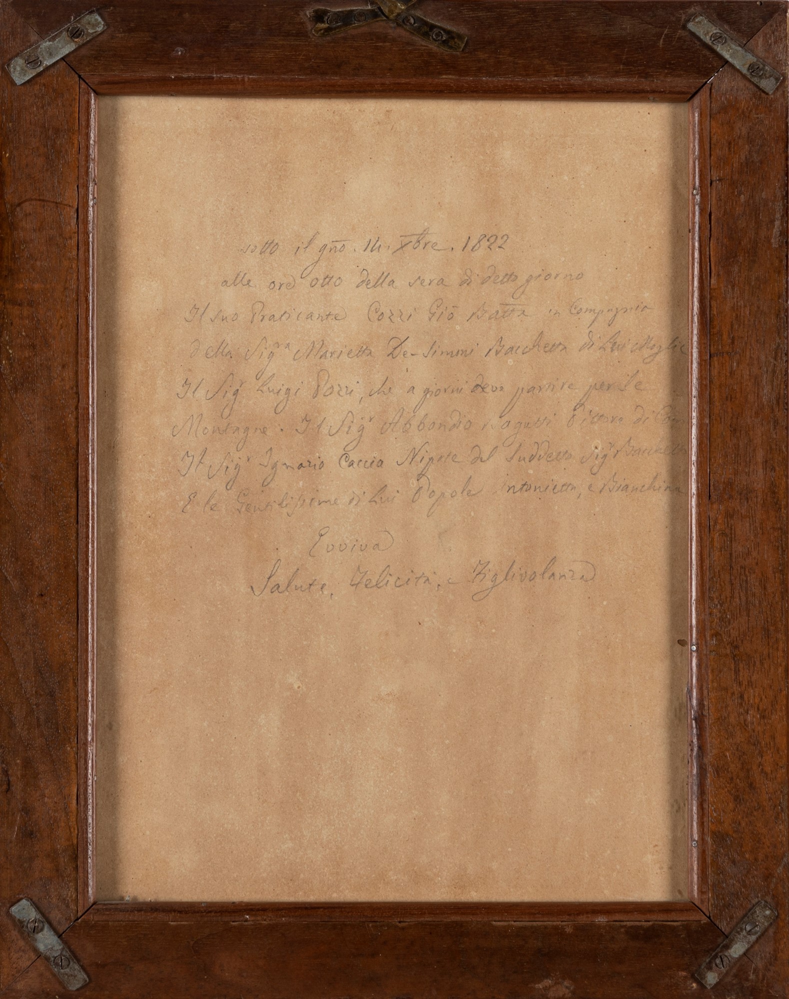 Sul retro, il ritratto femminile reca iscrizione: Sotto il giorno 14 ottobre 1822 / alle ore otto della sera di detto giorno / il suo praticante Cozzi Giò Batta in compagnia / della sig.ra Marietta De-Simoni Bacchetta di lui moglie / il sig Luigi Cozzi, che a giorni deve partire per le / montagne. Il sig Abbondio Bagutti pittore di (...) / il sig Ignazio Caccia nipote del suddetto sig Bacchetta / e le gentilissime di lui (...) Antonietta e Bianchina / Evviva / Salute, felicità, e figlivolanza.