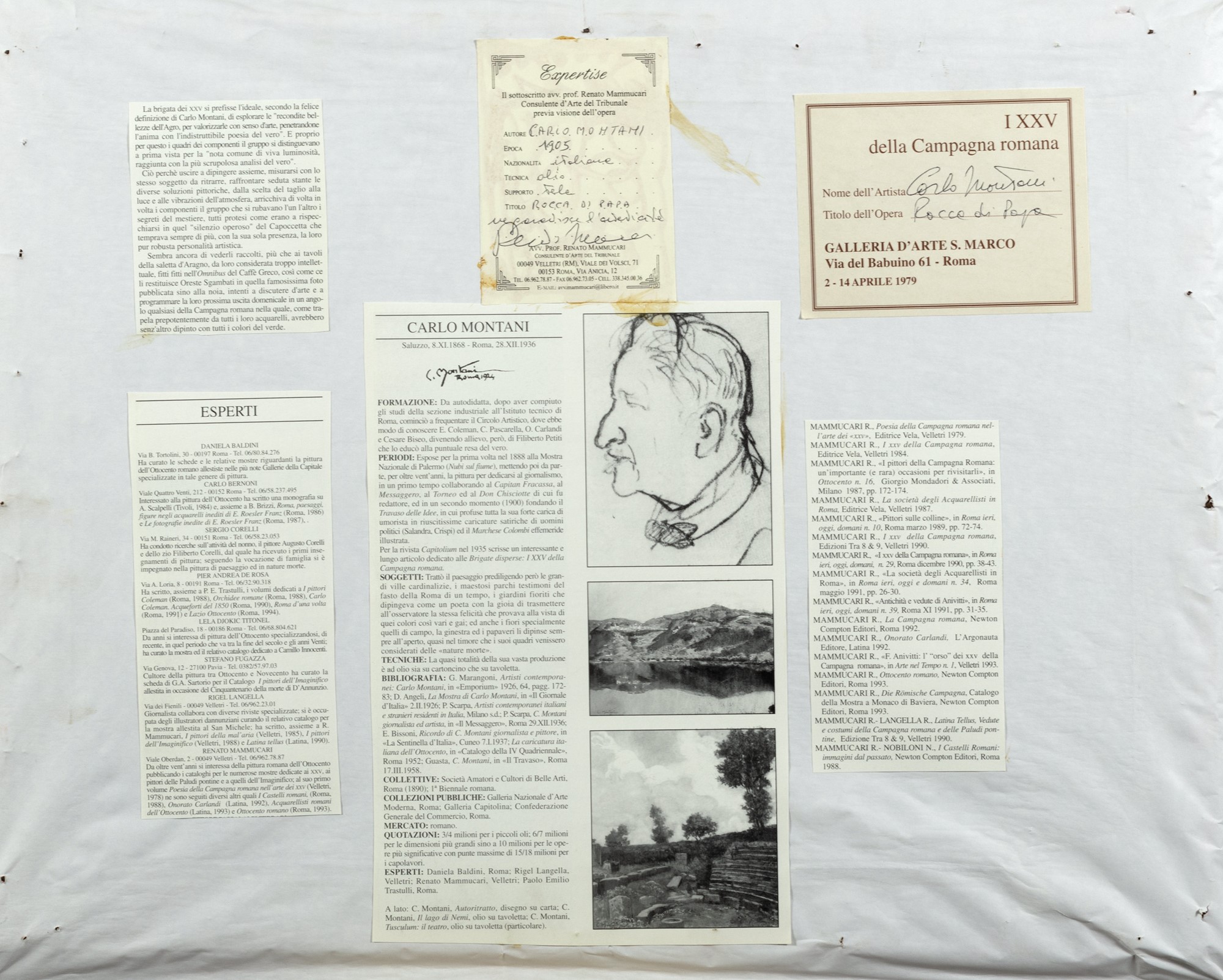 firmato e intitolato in basso a destra: C Montani / Rocca di Papa e dedicato e datato in basso verso destra: All'amico Pietro / Parbani (?) 1935. XIII