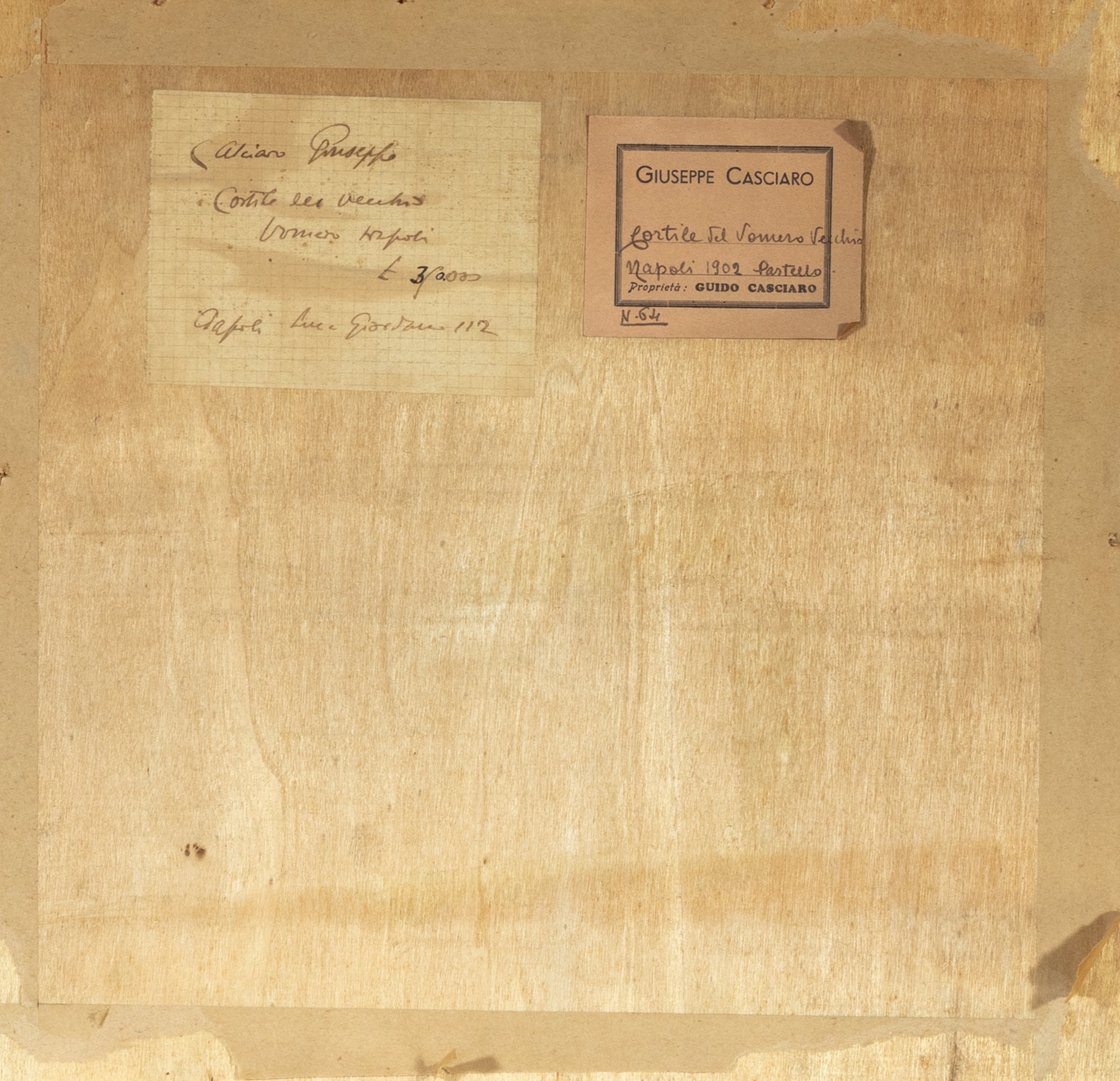 Sul retro timbro dell’artista; sul retro del legno di supporto: antico foglio a quadretti con scritti riferimenti al dipinto e all’artista; cartellino a stampa del figlio Guido Casciaro con titolo e numero di riferimento (64).