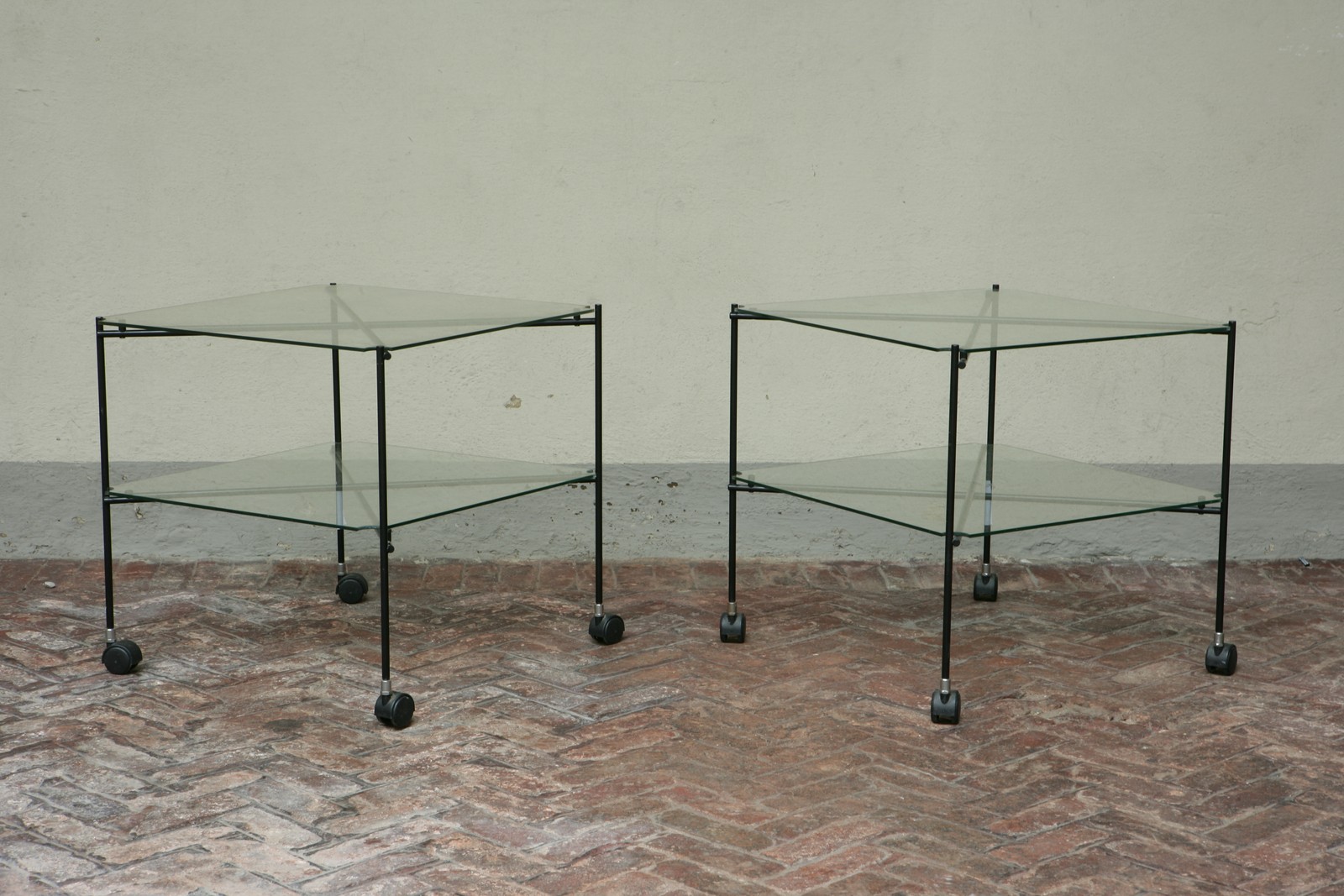 MINARI BRUNO. Due carrelli modello Biplano. Two tea trolley "Biplano". Acciaio e cristallo. Cm 51x49. Struttura in acciaio pieghevole, piani in cristallo. Produzione Robots. Folding steel frme, crystal shelves for Robots. 1979.