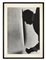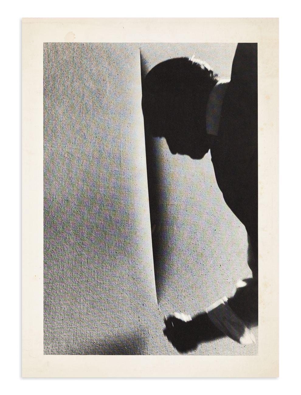 Fotografia in bianco e nero raffigurante Lucio Fontana nell'atto di tagliare una tela