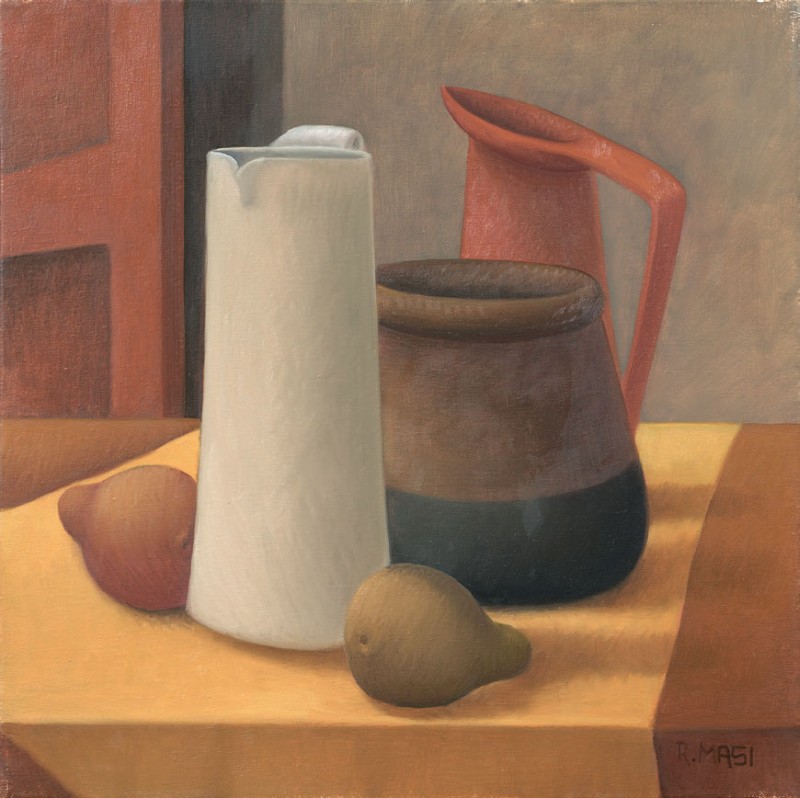 Roberto Masi Firenze 1940 Vaso brocche e pere Olio su tela, cm. 39,5x39,5 Firma in basso a destra e al verso: R. Masi. Bibliografia: Alessandro Parronchi, Roberto Masi, Edizioni KS, Firenze, 1986, pp. 206, 207, 222, tav. 87.