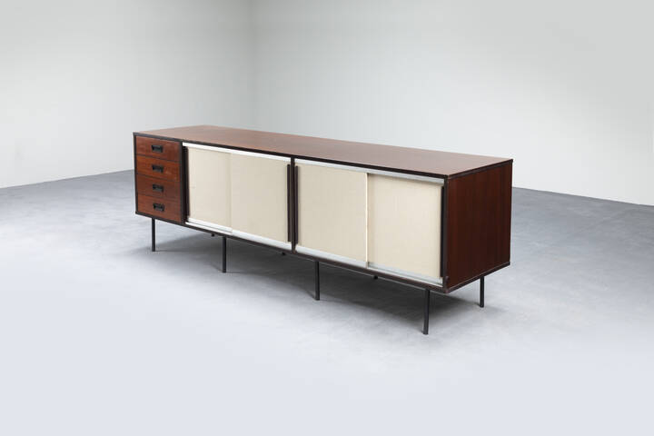 Sidebord con struttura in legno, una cassettiera , ante scorrevoli rivestite in tessuto, sostegni in metallo verniciato.
