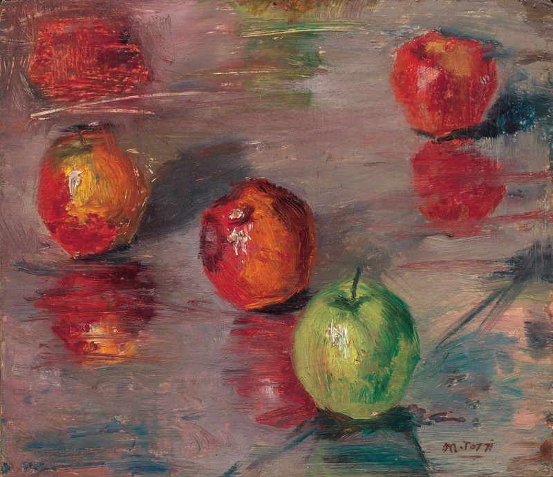 Mario Tozzi Fossombrone (PU) 1895 - St. Jean du Gard 1979 Quattro mele, 1919 Olio su cartone, cm. 30x35 Firma in basso a destra: M. Tozzi. Al verso: dichiarazione di autenticità di Nino Bertocchi, Bologna, 7 maggio 1954. Certificato su foto Archivio Tozzi, Foiano, con n. 2258.