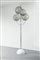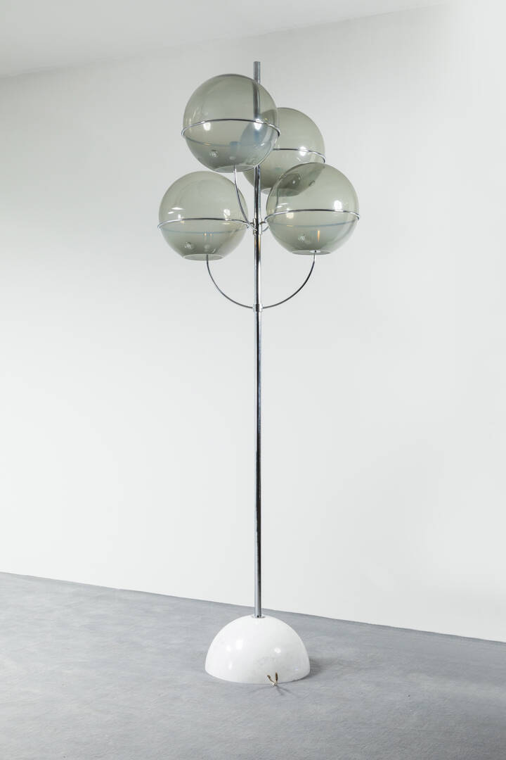 Lampada da terra con telaio cromato lucido e quattro bracci con diffusori in vetro soffiato a mano Vistosi. Base in marmo bianco emisferica.