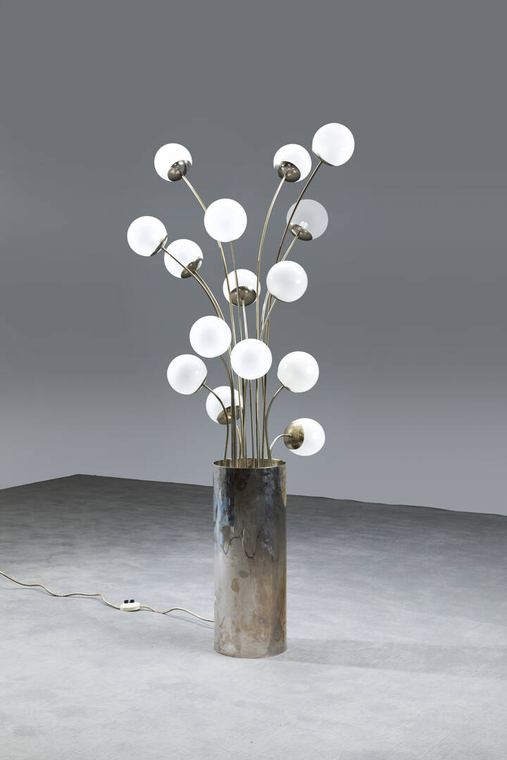 Lampada da terra con struttura in metallo cromato, diffusori in vetro .
