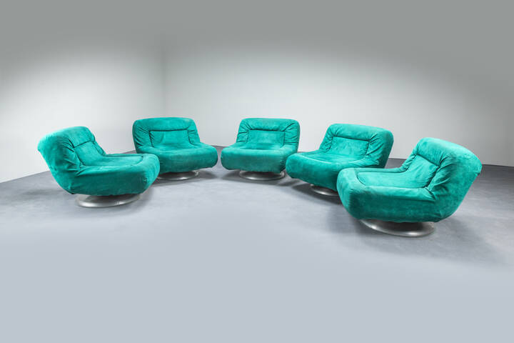 Cinque poltrone con imbottitura rivestita in velluto, base in acciaio.