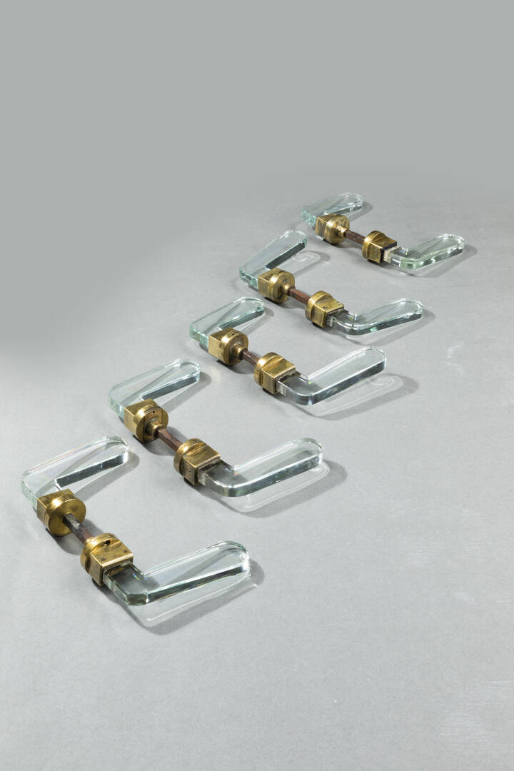 Cinque maniglie in ottone e vetro di forte spessore.