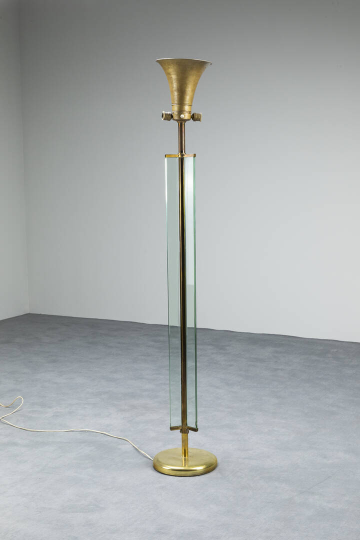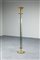 Lampada da terra in ottone, fusto rivestito da piastre in vetro colorato.
