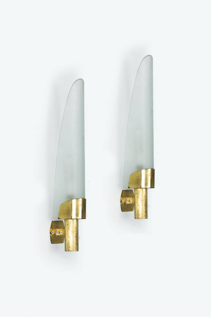 Coppia di lampade a muro in ottone, diffusori in vetro satinato.