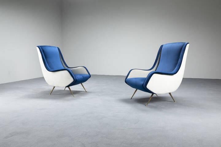 Coppia di poltrone con rivestimento in velluto bicolare, piedi in ottone.
