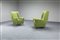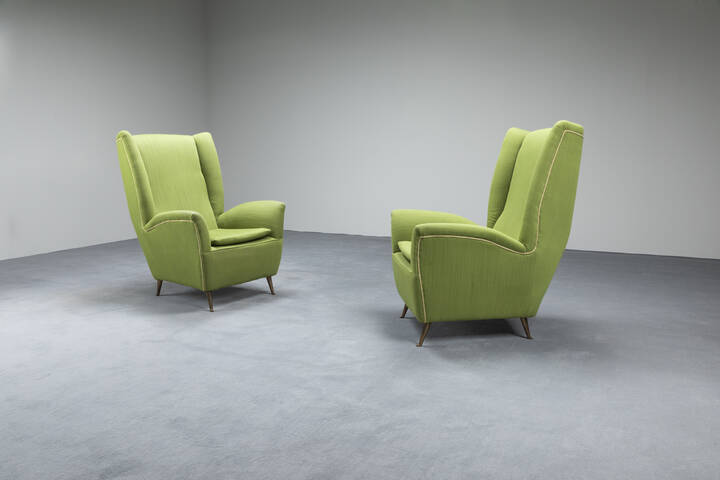 Coppia di poltrone cn imbottitura rivestita in tessuto, gambe in ottone.