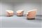 Tre poltrone con imbottitura rivestita in tessuto, piedi conici in legno,