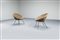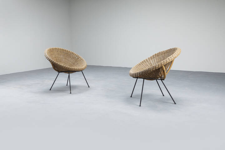 Due poltroncine in vimini, struttura in tondino di metallo.