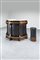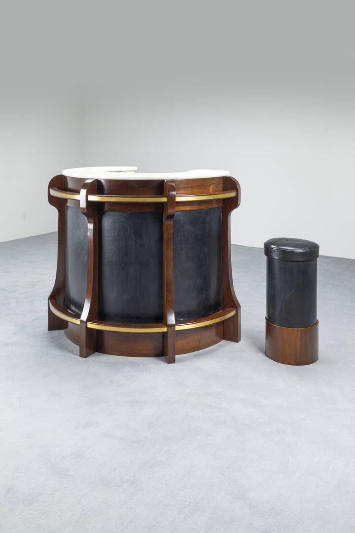 Mobile bar in legno con particolari in ottone, sgabello rivestito in cuoio.