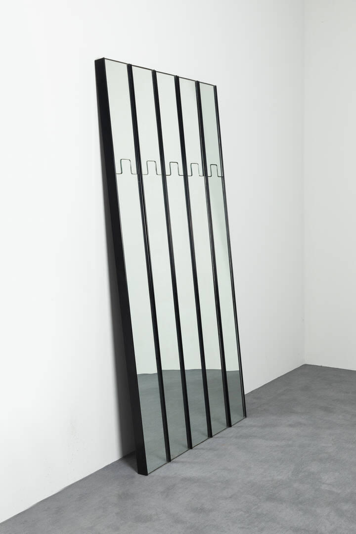 Elementi modulari rivestiti da specchi, gancio a scomparsa. Corredati dagloia attacchi a muro