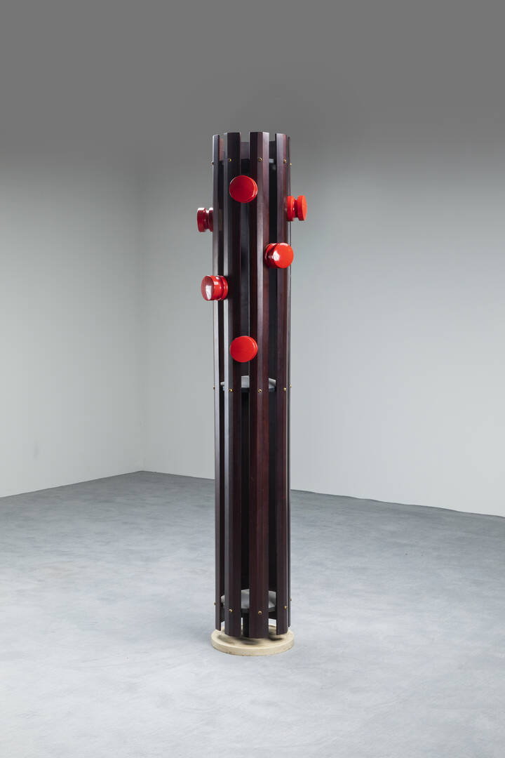 Appendiabiti girevole formato da listelli di legno, appoggi in metallo verniciato regolabili in altezza, base in marmo.
