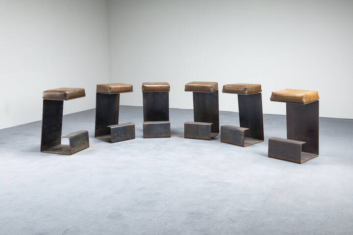 Set composto da sei sgabelli in metallo piegato , seduta imbottita con rivestimento in pelle.