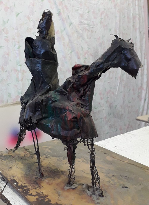 Scultura in metallo dipinta, applicata su base di legno.