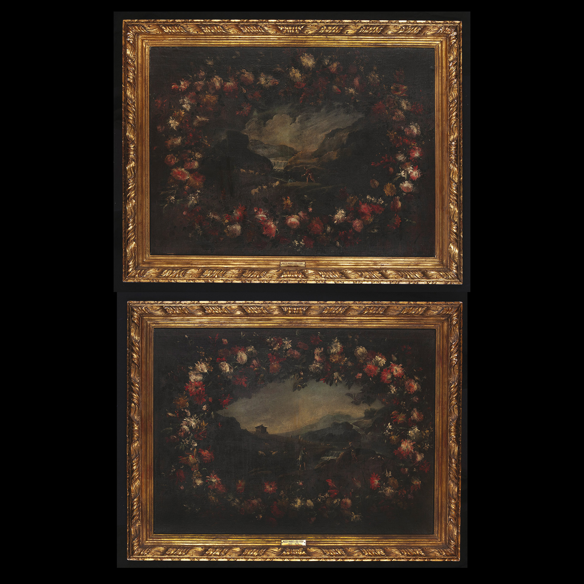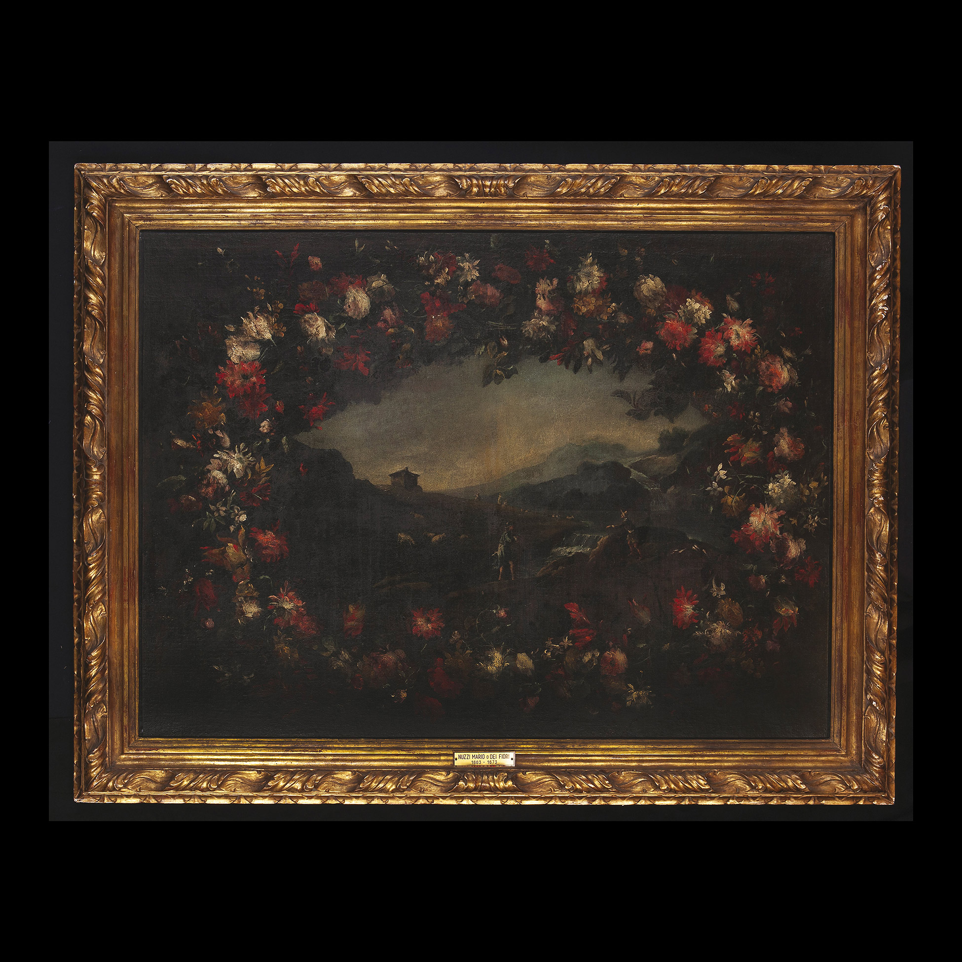 Mario Nuzzi detto Mario de’ fiori (Roma, 1603 – Roma 1673), Coppia di paesaggi con corona di fiori La fortunata produzione di Mario de’ fiori è legata sia alla sua biografia che al gusto per la pittura contemporanea di natura morte con fiori. Nipote del celebre caravaggista Tommaso Salini, si forma a Roma nella bottega dello zio e alla sua morte ne eredita il folto numero di clienti, che si affidano a lui per la sua straordinaria perizia di fiorante, maturata anche alla luce dell’attività di floricoltore di suo padre Sisto. Eredità dello zio risulta essere anche il legame che il pittore stringe con Cassiano dal Pozzo, che fu per lui un tramite importante per la conoscenza di artisti internazionali suoi contemporanei, ma soprattutto per i mecenati della corte barberiniana; nel 1634 risulta nei registri dell’Accademia di San Luca e dal 1646 è tra i virtuosi del Pantheon. Questa coppia di ghirlande con paesaggio rurale e figure è probabilmente appartenente alla prima fase della produzione dell’artista, una fase di ricerca e sperimentazione. La pennellata è decisa, poco analitica, quasi espressionistica; questo pendant è caratterizzato da un raro fondo scuro, non appartenente alla maturità dell’artista, ancora poco sensibile al gusto vivace e luministico del pieno barocco. Olio su tela, cm est. 157x130, int. 142x105