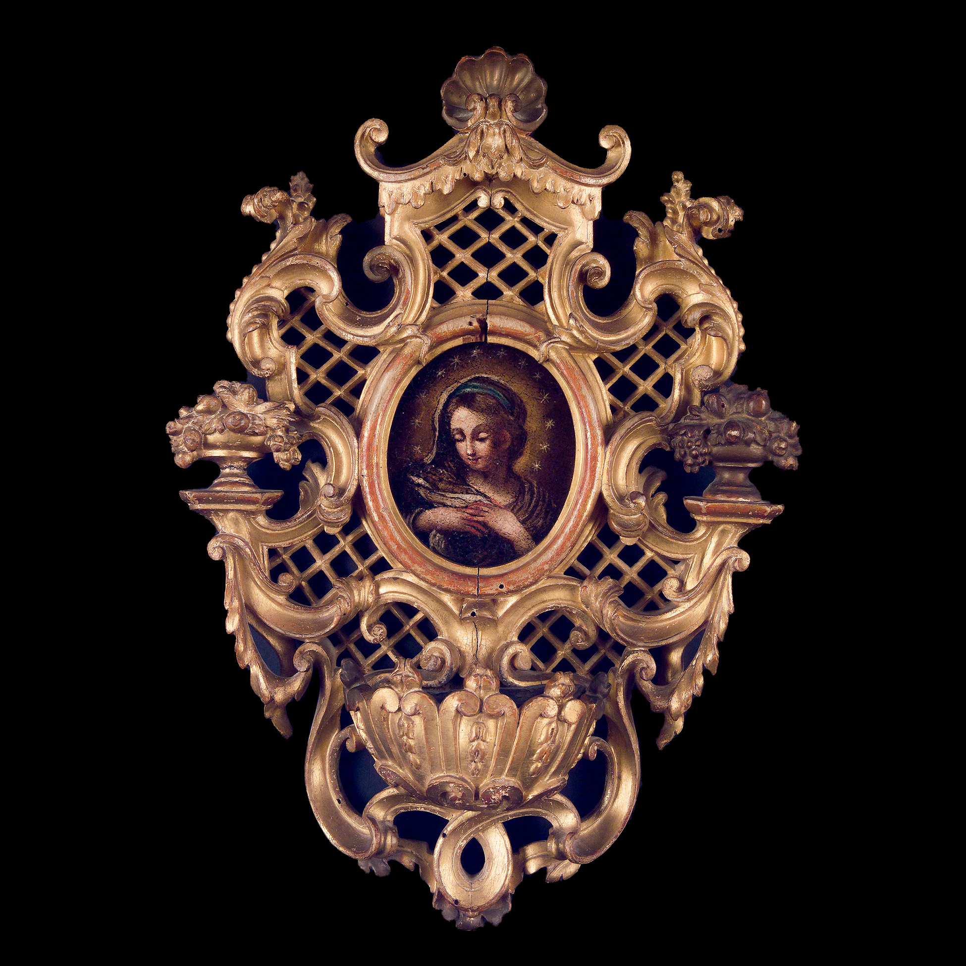 Scuola romana del XVIII secolo, Acquasantiera con Madonna Elegante acquasantiera in legno traforato e dorato, decorato in forma di elementi vegetali, volute e valve. Al centro un piccolo dipinto circolare raffigurante una Madonna secondo l'iconografia dell'Immacolata Concezione. Questo manufatto è riferibile alla produzione di un ignoto artista romano della prima metà del Settecento. Olio su tavola, dimensioni ext. 40x 28, int. 29x40 cm.