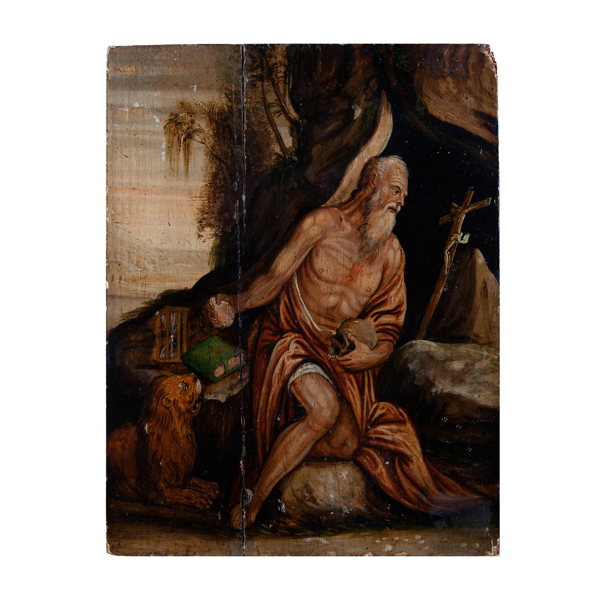 Pittore veneto del XVI secolo, San Girolamo nel deserto Pittore veneto del XVI secolo, San Girolamo nel deserto Dipinto su tavola, presenza di una fenditura Dipinto su tavola, dimensioni 27,5x22 cm.