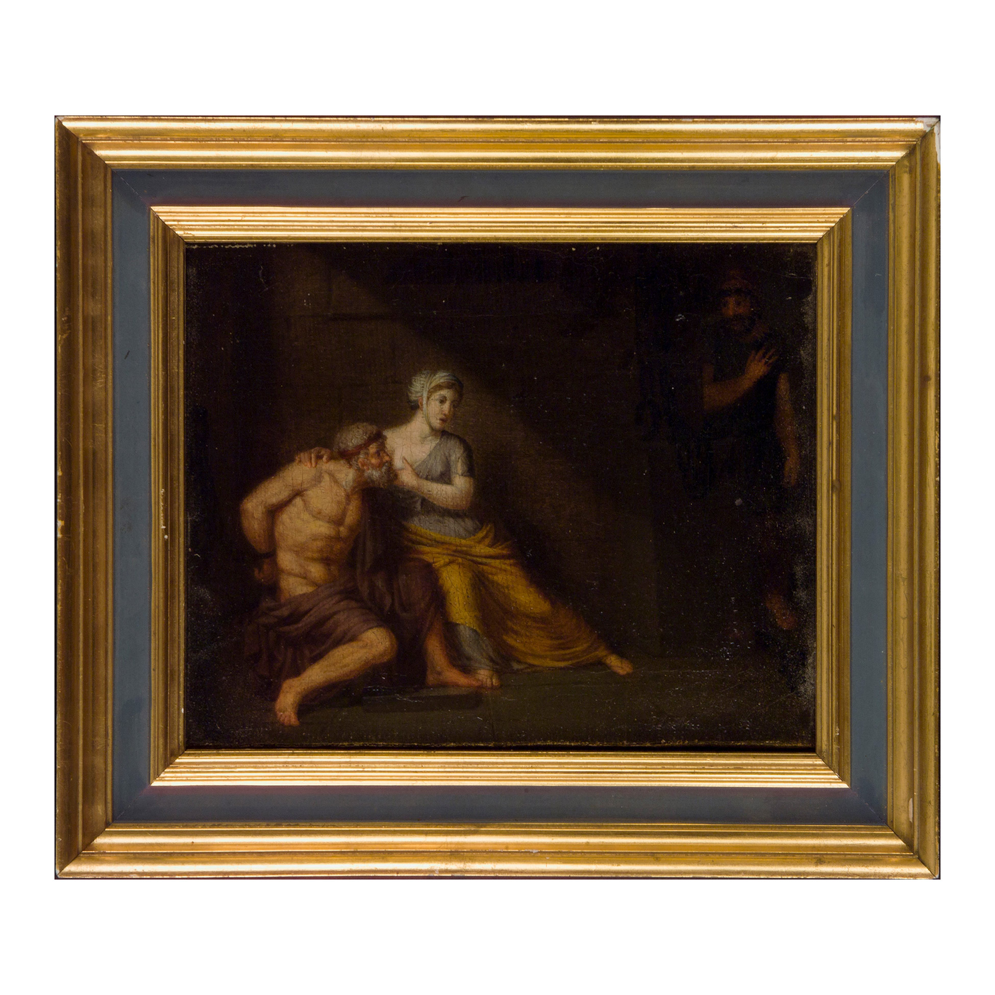 Pittore romano degli inizi del XIX secolo, Caritas Romana L'ignoto pittore riprende in questo dipinto una storia cara alla pittura romana dal XVII secolo in poi, quella di Cimone e Pero. L'anziano viene condannato a morte per fame e la giovane figlia lo allatta in carcere per farlo sopravvivere; una guardia la scopre e rimane impressionata dalla generosità della giovane. I funzionari concedono la grazia all'anziano padre di Pero, per celebrare l'onore romano di lei. Il pittore qui ha ben presenti le lezioni più vivide fornite da importanti pittori nel corso dei secoli: nella posa di Cimone è ben riscontrabile l'esempio di Luca Giordano e Rubens. Olio su tela, dimensioni ext. 27,5x32, int. 19x25,5 cm.