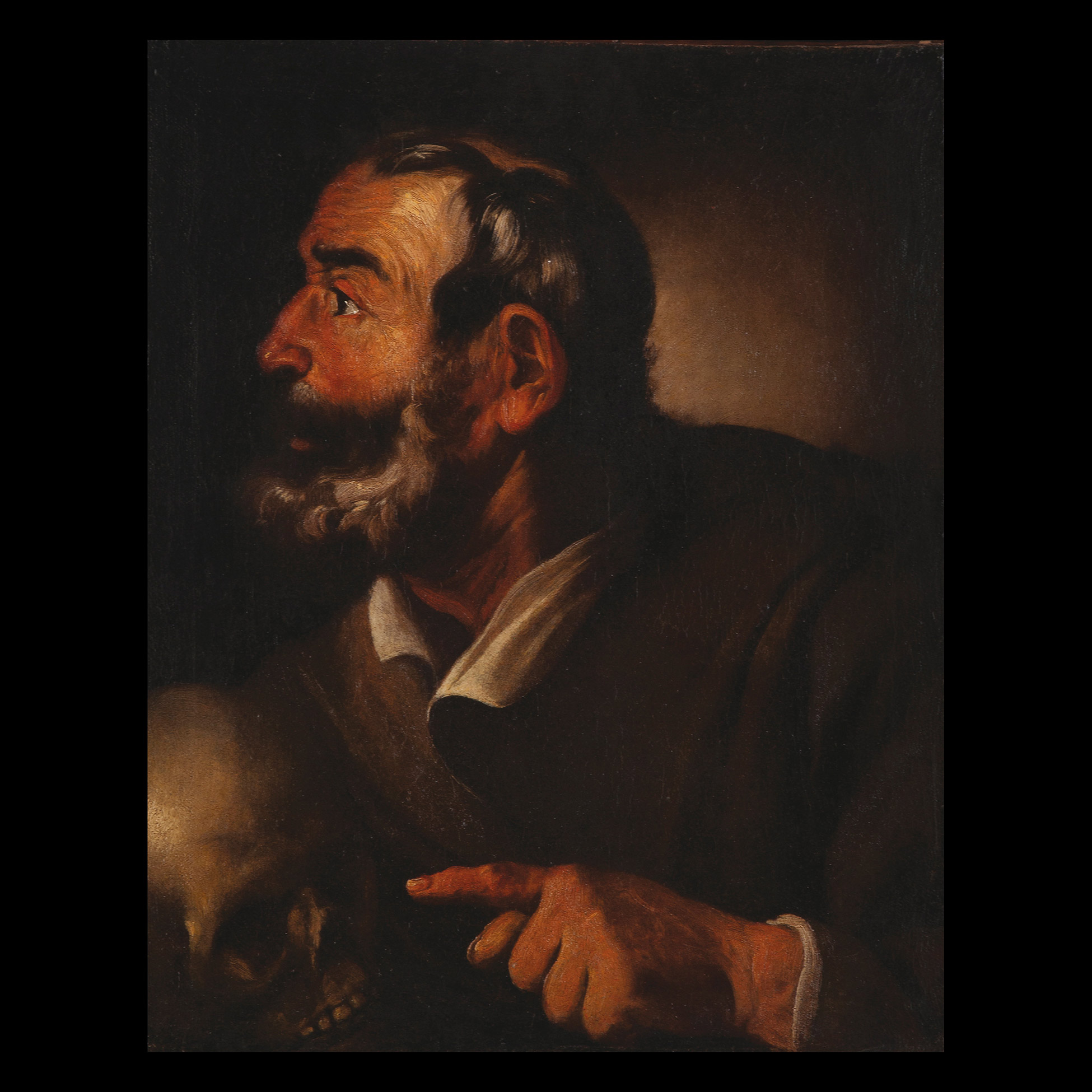 Francesco Fracanzano (Monopoli, 1612 – Napoli, 1656), bottega di, Memento Mori Francesco Fracanzano si trasferisce molto presto a Napoli, per entrare nella bottega di uno dei pittori più rinomati del momento: Jusepe de Ribera. Inizialmente il pittore aderisce allo stile pastoso e cromaticamente violento del suo maestro, ma nella sua fase più matura se ne discosta gradualmente, per abbracciare una lettura più classicistica degli elementi compositivi e una sempre più convinta adesione alle proposte fiamminghe; ma vera dote del pittore è di certo la capacità di legare queste esperienze tra loro, sintetizzandole in uno stile unico. Quest’opera di bottega raffigura un saggio anziano che sembra discorrere con qualcuno all’esterno della scena riguardo la fugacità dell’esistenza: sembra voler rammentare al suo interlocutore l’ineluttabilità della morte; non è da escludere la possibilità che in passato facesse parte di un pendant. Il taglio estremamente ravvicinato, l’espressività tutta protesa “fuori campo” dell’uomo lasciano presumere l’esistenza di un dipinto a lui corrispondente. Olio su tela, cm 62x50