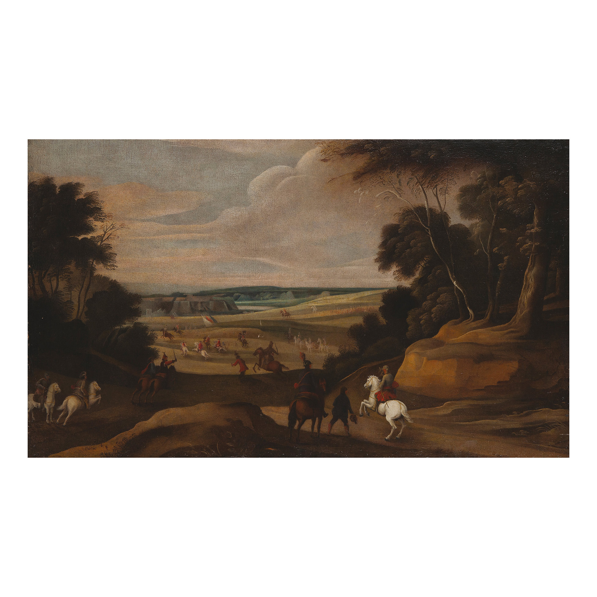 Seguace di Paul Bril (Anversa, 1554 – Roma, 1626) Scena di battaglia Questo dipinto illustra un vasto paesaggio, una vasta vallata spoglia, fiancheggiata da verdi alberi. Corrono verso la piana un gruppo di soldati, non compatti ma sparsi in ogni dove, e appena accennati quando si sono raffigurati in lontananza. Il paesaggio naturale non risente della indeterminatezza dei contorni data dalla profondità del paesaggio; al contrario, i singoli elementi sono tutti ben identificabili.Facciamo risalire un dipinto di questo genere ad un pittore che ha forse operato nell’ambito del più famoso Paul Bril e di cui ha conosciuto l’opera.Possiamo desumerlo dalla larga pennellata con cui è costruito il paesaggio, una pennellata quasi “liquida”; ma l’artista però dedica un’attenzione particolare alla resa del dettaglio del singolo elemento, come da buona tradizione fiamminga: ne sono un esempio i rami ornati di foglie o la criniera del cavallo scossa dal vento. Bibl.: F. Cappelletti, Paul Bril e la pittura di paesaggio a Roma 1580-1630, Roma 2005-2006, ad vocem. Olio su tela, cm 150x90