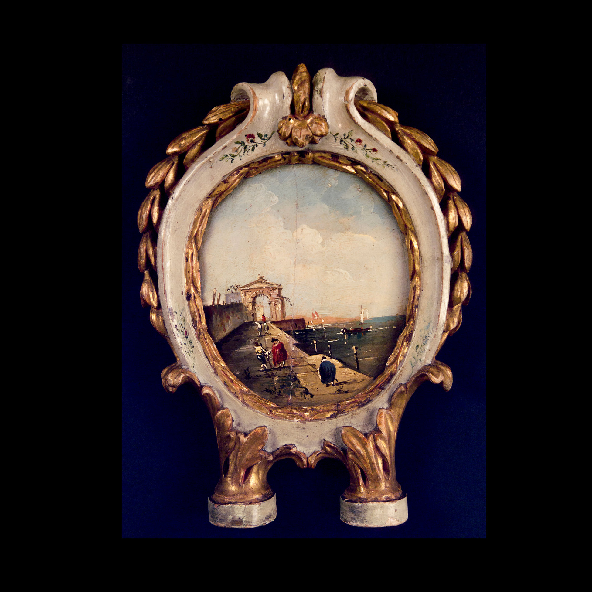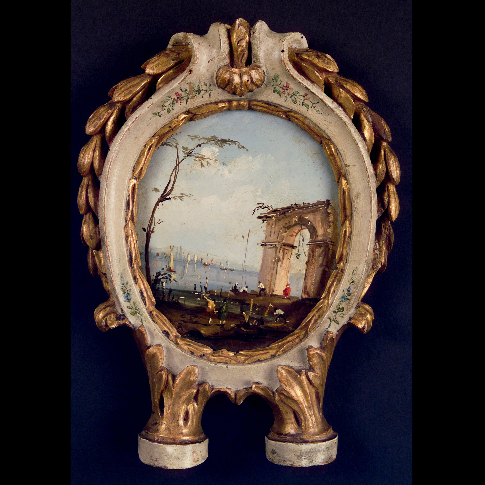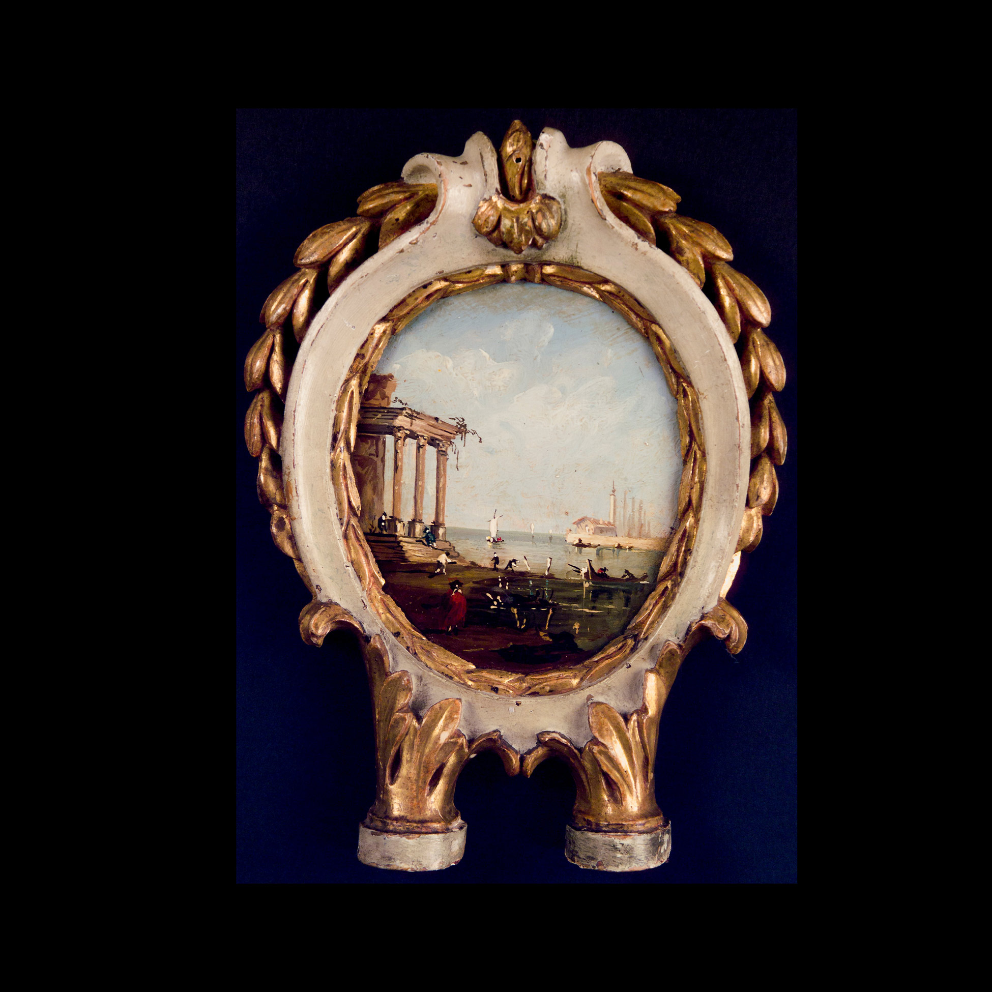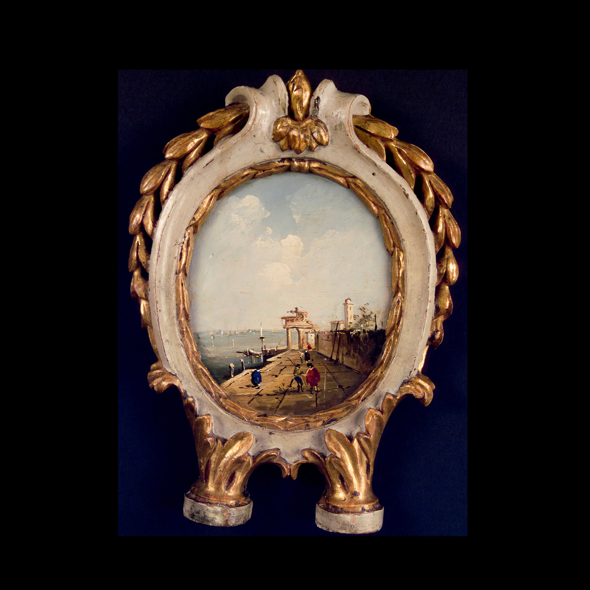 Francesco Guardi (Venezia 1712 – 1793), ambito di, Quattro dipinti ovali con scene portuali Queste quattro piccole vedute incorniciate da eleganti cornici parzialmente dorate e dotate di supporti, sono ascrivibili alla produzione di piccole vedute e capricci che vennero prodotti copiosamente in ambito veneziano nella seconda metà dell'Ottocento. L'attribuzione all'ambito di Franesco Guardi si deve ad una resa molto nitida e fresca del soggetto, così come alla pennellata sciolta e al gusto prettamente illustrativo della raffigurazione. Olio su tavola, dimensioni ext. 27x20, int. 15,5x13,5 cm.