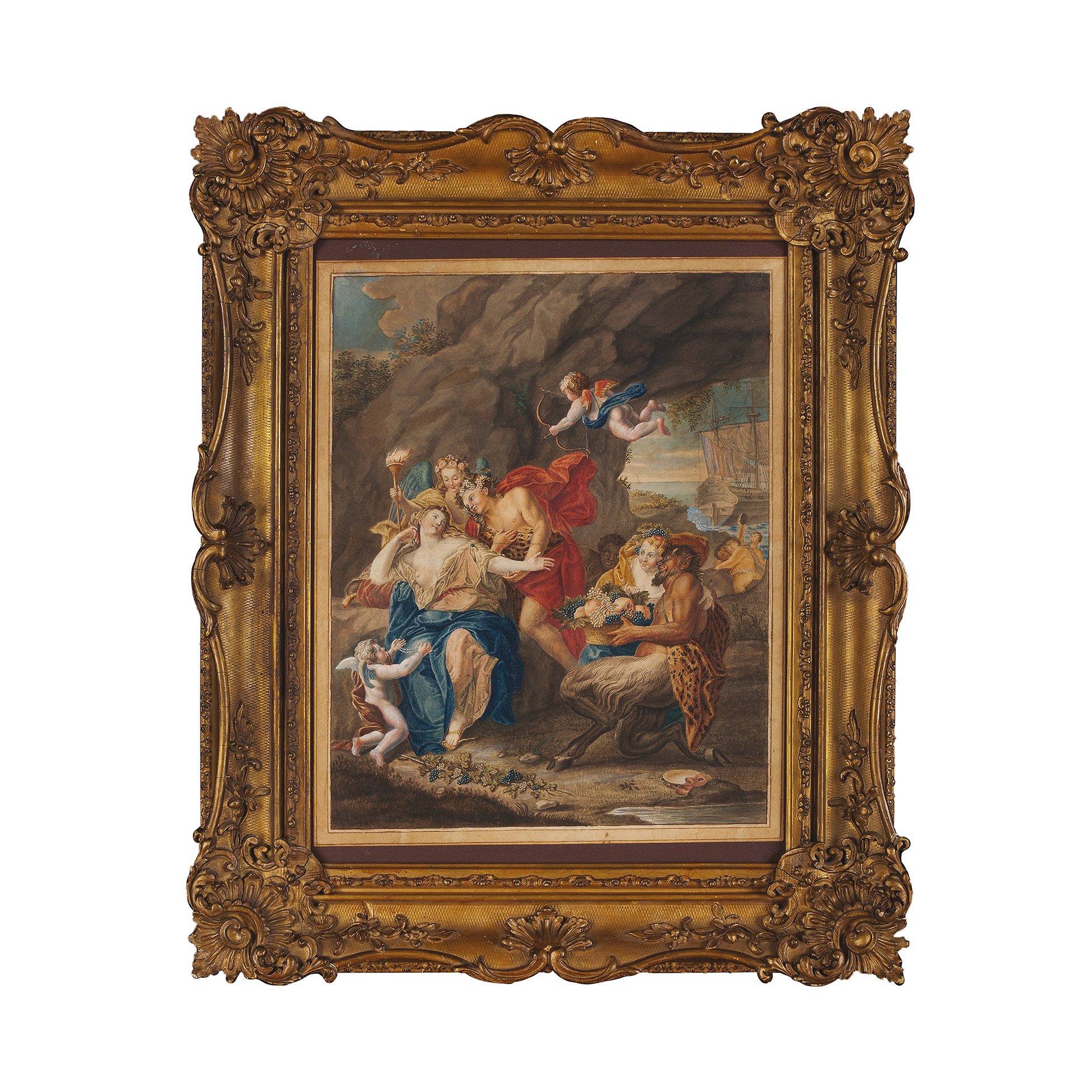 Pittore fiammingo del XVIII secolo Trionfo di Bacco e Arianna In questo delicato acquerello su cartoncino – impreziosito da una ricca cornice dorata – è illustrato uno dei momenti più celebri del mito che lega Bacco e Arianna. La principessa figlia del re Minosse e Pasifae, dopo essere stata abbandonata dall’amato Teseo sull’isola di Nasso, viene raggiunta dal Dio Bacco, che la salva facendone la sua sposa.Spesso, come in questo caso, al tema del salvataggio si aggiunge un corteo di personaggi indicanti il tema matrimoniale che accompagna la coppia; alle spalle di Arianna è visibile una Nike recante una torcia, mentre ai suoi piedi, un putto le offre in dono una collana. Sul lato destro della composizione invece, un satiro e una ninfa recano alla coppia un cesto ricco di frutti prelibati, come augurio di un legame all’insegna della gioia e dell’abbondanza. In alto Cupido è raffigurato con gli occhi chiusi nell’atto di scoccare la freccia che unisce gli amanti in un profondo legame; sullo sfondo è raffigurata la nave con la quale il Dio è giunto in soccorso della sua sposa. Infine, è possibile scorgere, in ritardo rispetto al resto del corteo, l’asino cavalcato da Sileno: sembra quasi possibile udire i versi scritti da Lorenzo il Magnifico nel 1490: “Questa soma, che vien drieto sopra l’asino, è Sileno: così vecchio è ebbro e lieto, già di carne e d’anni pieno; se non può star ritto, almeno ride e gode tuttavia. Chi vuole esser lieto, sia: di doman non c’è certezza.”La tecnica leggera, il soggetto amoroso, la dimensione contenuta dell’opera lasciano presumere che quest’opera sia stata realizzata per una committenza privata, destinata ad un uso perlopiù decorativo, realizzato in ambito fiammingo forse su modello di un ciclo decorativo italiano del Seicento. Bibl.: R. Bruscagli, a cura di, Trionfi e canti carnascialeschi toscani del Rinascimento, Salerno, 1986. Acquerello su cartoncino, cm est. 66x54, int. 51X39