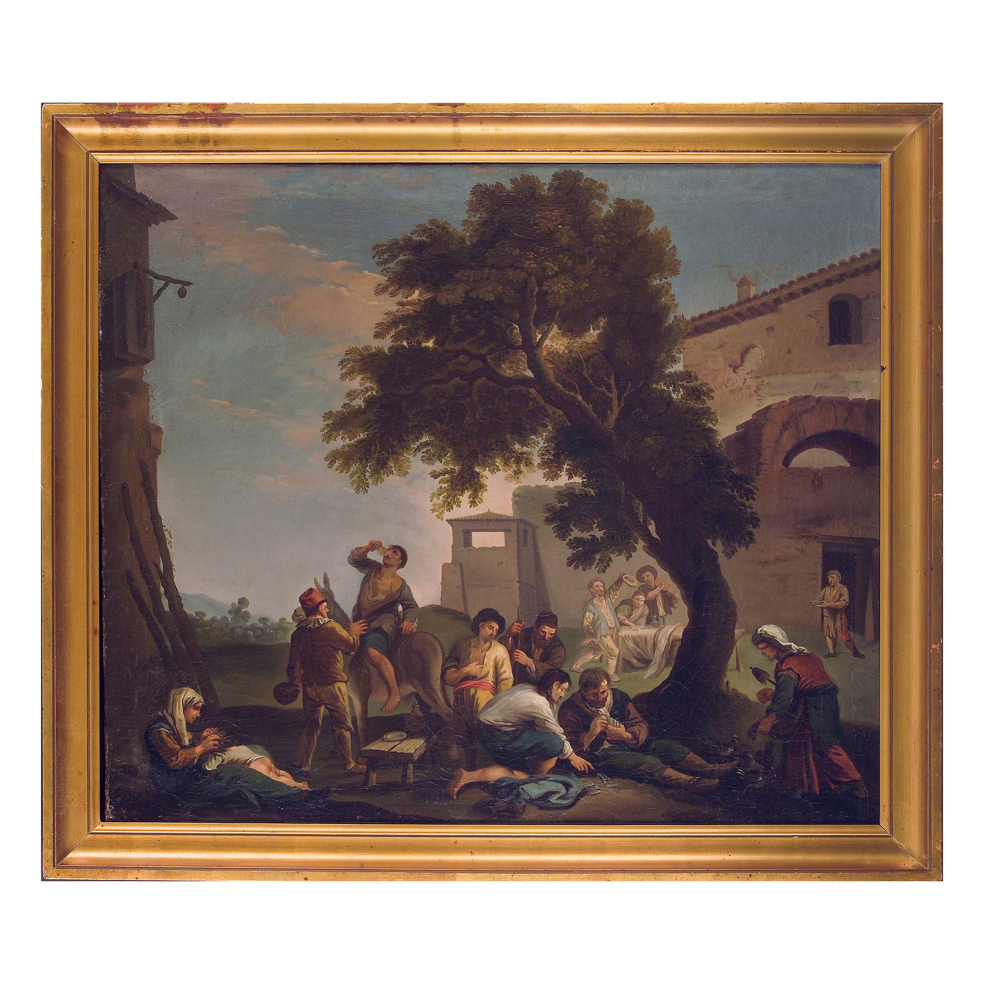 Paolo Monaldi (Roma 1710 – dopo il 1779), Scena di osteria Questa ricca composizione del pittore romano Paolo Monaldi è un perfetto esempio della pittura romana bambocciante della prima metà del Settecento. L'allegria della scena prodotta si accompagna ad uno studio puntuale dell'ambientazione popolare e alla resa tersa ma ben dettagliata degli elementi naturalistici, ripensati con grande attenzione e opposti all'ondata degli sfondati barocchi, veri prodotti dell'intelletto piuttosto che dello sguardo. Olio su tela, dimensioni ext. 70,5x83, int. 61,5x73,5 cm.