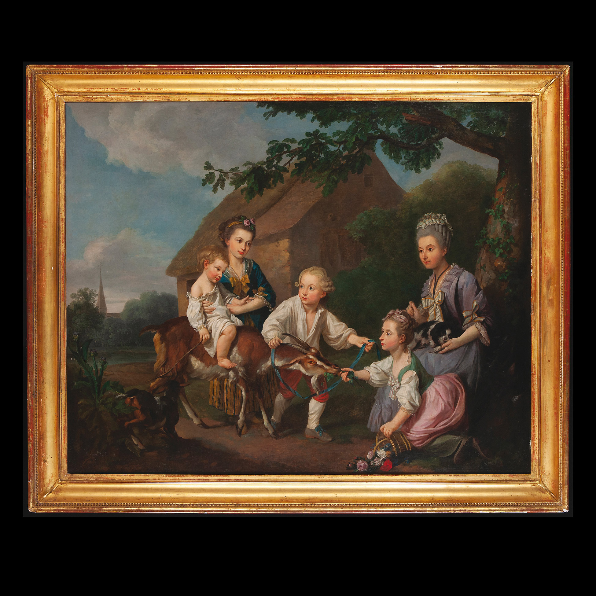 Pittore francese della fine del XVIII secolo Scena campestre Questo raffinato olio su tela è probabilmente da riferirsi ad un ambito francese, probabilmente della fine del Settecento. Non è giunto sino a noi il nome dell’autore del dipinto, ma è evidente che si tratti di una prova pittorica di grande qualità: la scena raffigura una madre con i suoi quattro figli che si dilettano in campagna, insieme a vari animali.Alla stregua delle opere del Fragonard, in quest’opera sono illustrati i caratteri tipici della scena bucolica: il gruppo è immerso in una natura ricca ma non selvaggia, vicino ad un corso d’acqua ma non troppo lontano da una cittadina, come mostra il campanile rappresentato sullo sfondo. L’essenziale casolare alle spalle dei protagonisti contrasta piacevolmente con gli abiti, luminosi ma non di certo sfarzosi delle donne; il gruppo è accompagnato da una capra che funga da cavalcatura per uno dei due bambini più piccoli e da due cani. In opere come questa il pittore riserva tutta la sua capacità alla resa plastica e luminosa della composizione, che trasmette calma e serenità; è un quadro che non ha pretesa di istruirci su qualche avvenimento in particolare, è un quadro piacevole e di una grande qualità pittorica.Si noti la densità della pennellata – decisa e ben padroneggiata - e la varietà di temi con cui il pittore si confronta: figura umana, paesaggio, animali, natura morta; il soggetto scelto e la sua resa guardano molto alla leggerezza e all’assenza di preoccupazioni tipici dell’aristocratico, mentre lo stile fermo e le masse compatte richiamano quasi una compostezza che quasi anticipa i dettami neoclassici. Olio su tela, cm est. 150x180, int. 128X160