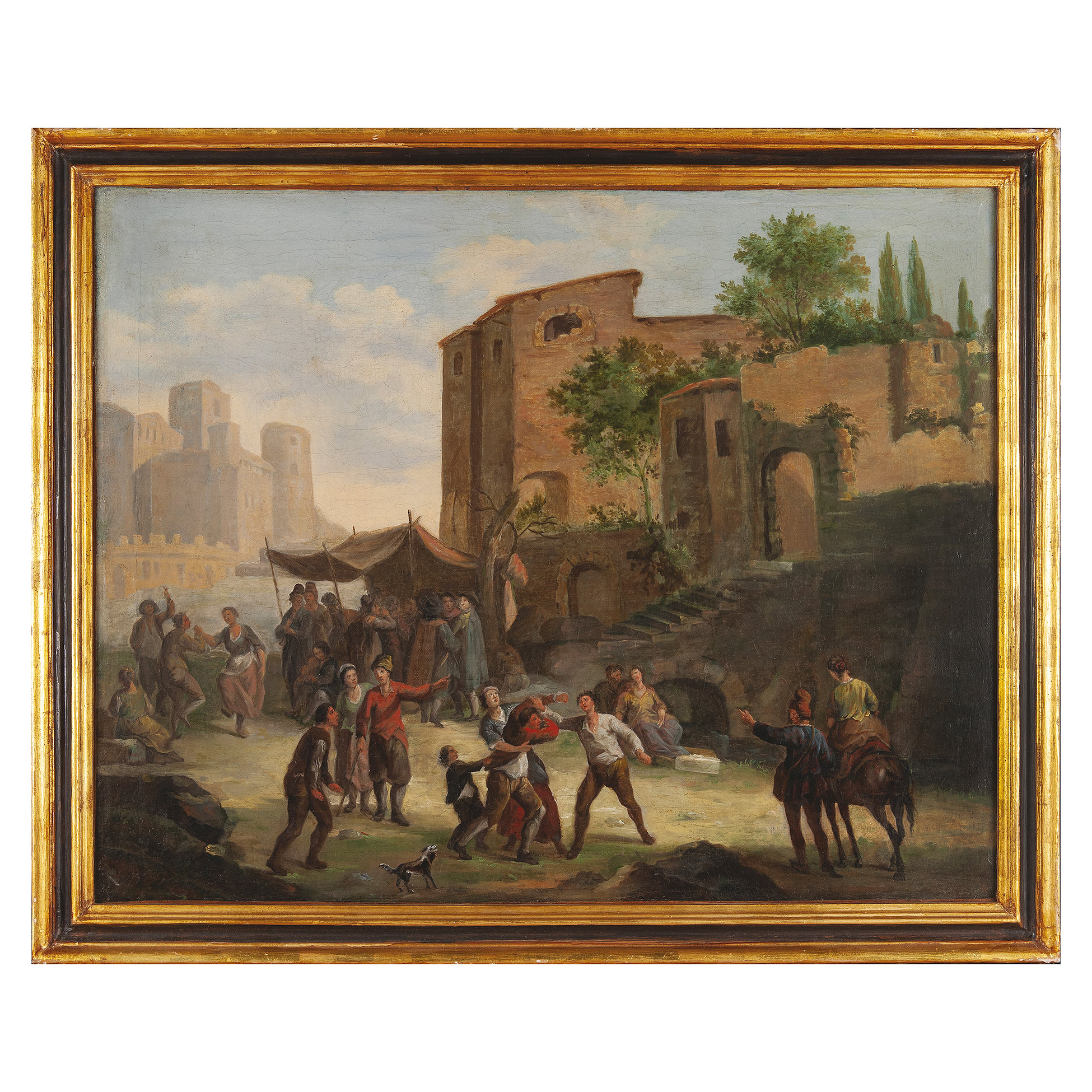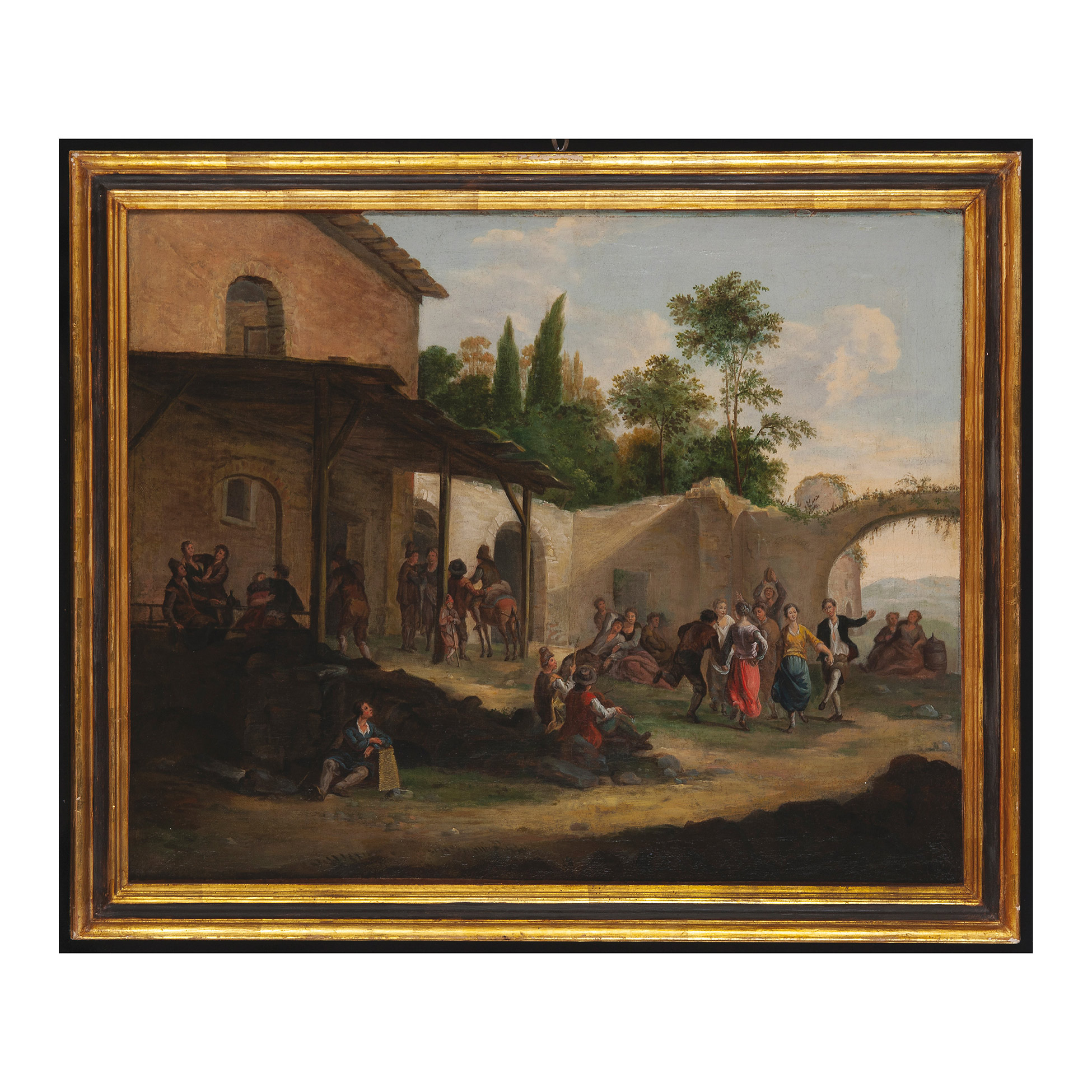 Pietro Domenico Olivero (Torino, 1679 – Torino, 1755), Coppia di scene campestri di fronte ad una locanda Il più grande merito di questo artista fu quello di essere un lucido, apprezzato ed ironico interprete della società piemontese della prima metà del XVIII secolo. L’infermità che lo affliggeva dalla nascita – era storpio ad entrambe le gambe – non gli impedì di crescere curioso e ricco di inventiva. L’Oliviero si forma all’ombra delle esperienze piemontesi dei pittori fiamminghi le cui opere erano rimaste nelle collezioni private torinesi. Le sue capacità e la sua amabilità d’animo gli permisero di entrare nelle grazie del principe di Piemonte Vittorio Amedeo II, il quale lo spronò sempre a dedicarsi alla rappresentazione di temi aulici, ritratti dell’alta borghesia o della vita di corte. L’animo del pittore era e resterà sempre quella di un bambocciante stricto sensu: le scene rappresentate da questi pittori erano sempre originali, non mancavano mai di illustrare un qualche dato curioso e raffiguravano temi sempre estremamente variegati, così come ci si aspetta da una curiosa indagine della realtà. Olio su tela, cm est. 72.5x88.5, int. 62.2x78 cad.