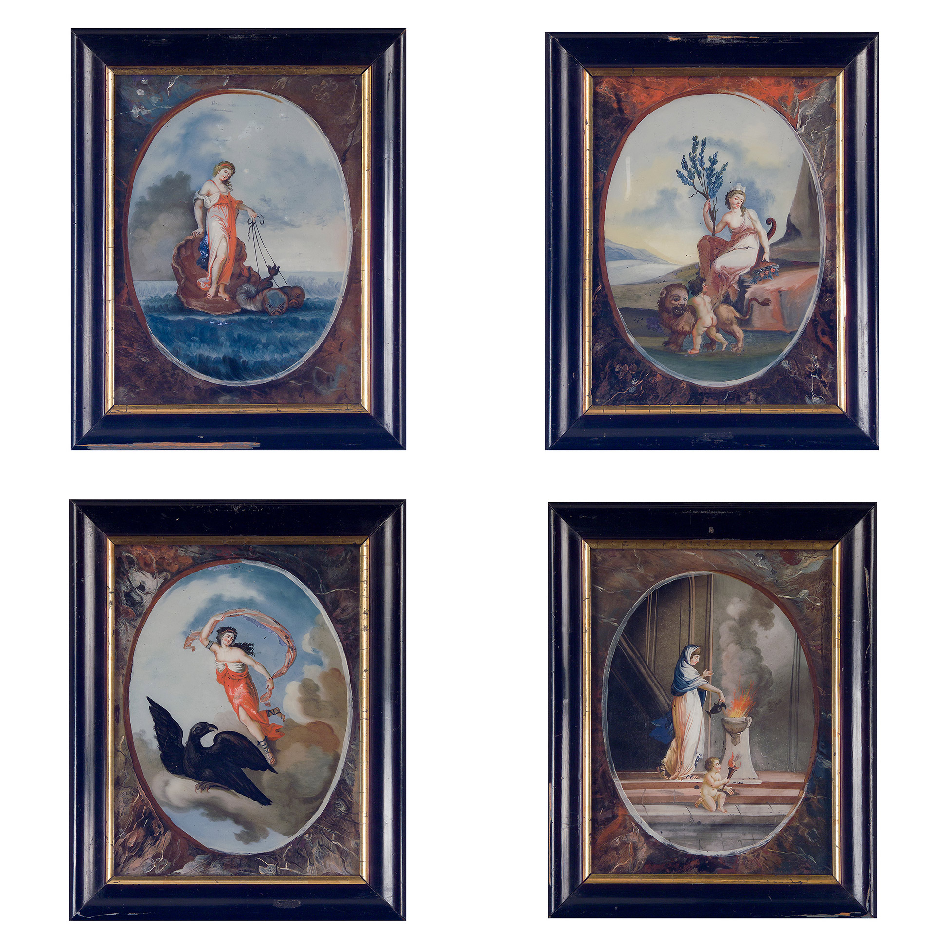 Scuola veneta del XVIII secolo, Allegoria dei quattro elementi Questa elegante composizione raffigurante le quattro personificazioni degli elementi naturali, è attribuibile ad un ignoto pittore probabilmente veneto del XVIII secolo. In Francia questa complessa tecnica venne impiegata in paesaggi asimmetrici guidati da una forte componente Rococò, così come in Germania, nelle Fiandre e nei Paesi Bassi venne usata per raffigurare battaglie, marine e scene di interni. La produzione norditaliana si differenzia, com'è evidenziato da queste quattro opere, da soggetti essenziali, composizioni compatte ed eleganti. Pittura su vetro invertito, dimensioni ext. 30,5x 24, int. 24x18 cm.