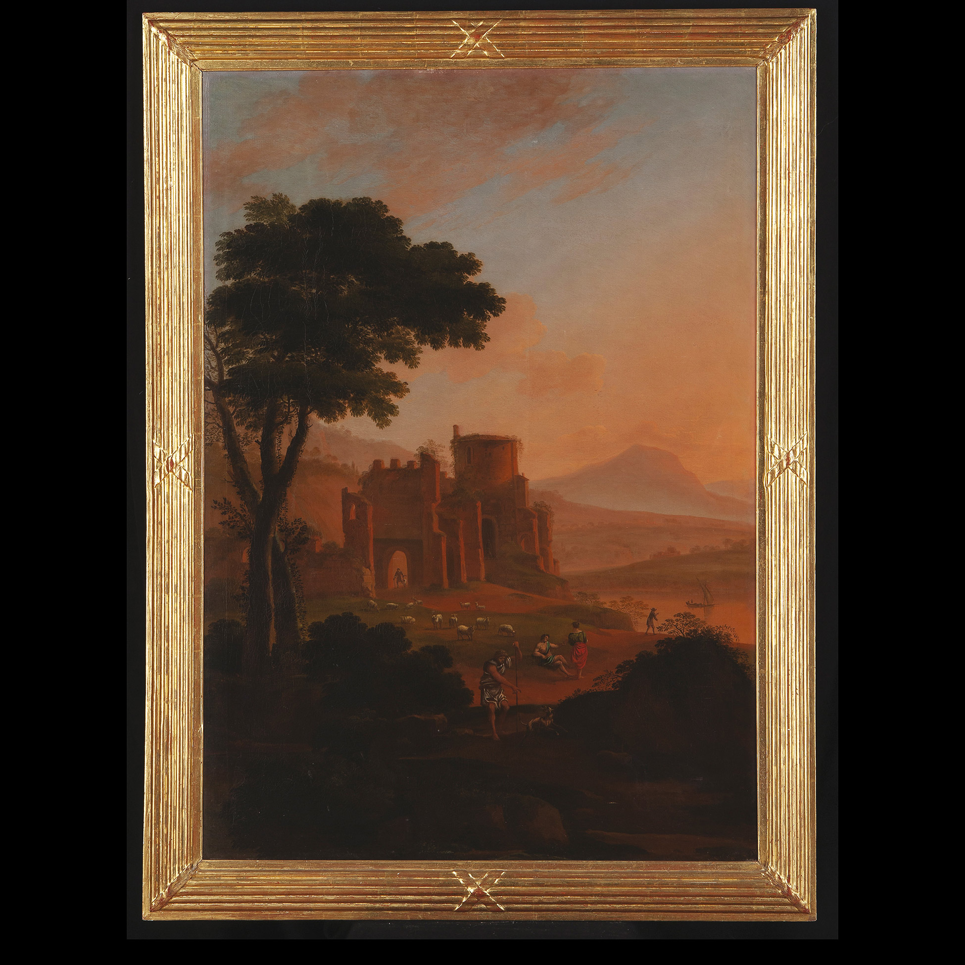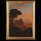 Scuola inglese del XIX secolo Veduta di campagna Durante tutto il XVIII secolo e l’inizio del XIX secolo, il genere del paesaggio in Inghilterra prende progressivamente le distanze dal paesaggio classico, ideale e immaginario della grande tradizione europea promossa da artisti quali Claude Lorrain, Gaspard Doughet e Salvator Rosa per assumere il proprio Paese e le sue istanze a soggetto prediletto della propria realtà pittorica. d ecco che da questo momento il vedutismo inglese si divide in due filoni: da un lato i pittori sono desiderosi di illustrare i profondi cambiamenti sociali in atto, la trasformazione delle città ad opera dell’industrializzazione e la nascita della borghesia; dall’altra, per contrasto a questi cambiamenti, un nuovo sentimento romantico della natura si fa strada in artisti come Gainsborough, Stubbs e nel primo Constable, desiderosi di descrivere una natura elegiaca, mesta, quasi malinconica.Questo olio su tela rispecchia perfettamente questa descrizione: un ampio paesaggio di scuola, avvolto da un caldo tramonto, offre un profondo scorcio abitato da alberi, monti e da uno specchio d’acqua; al centro di questa visione sorge il romantico rudere di un castello, ormai abitato da animali e pastori, quasi come in una novella Arcadia. Olio su tela, cm est. 128x94, int. 113X79.5