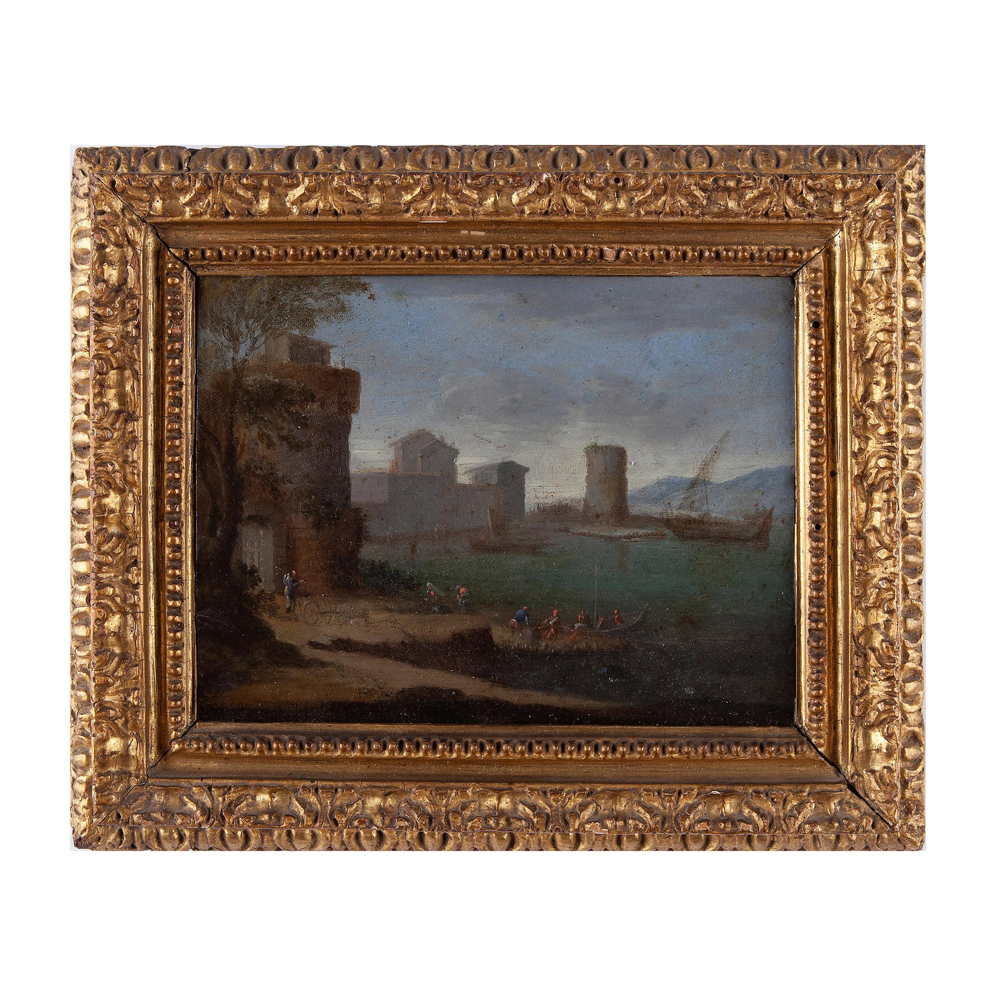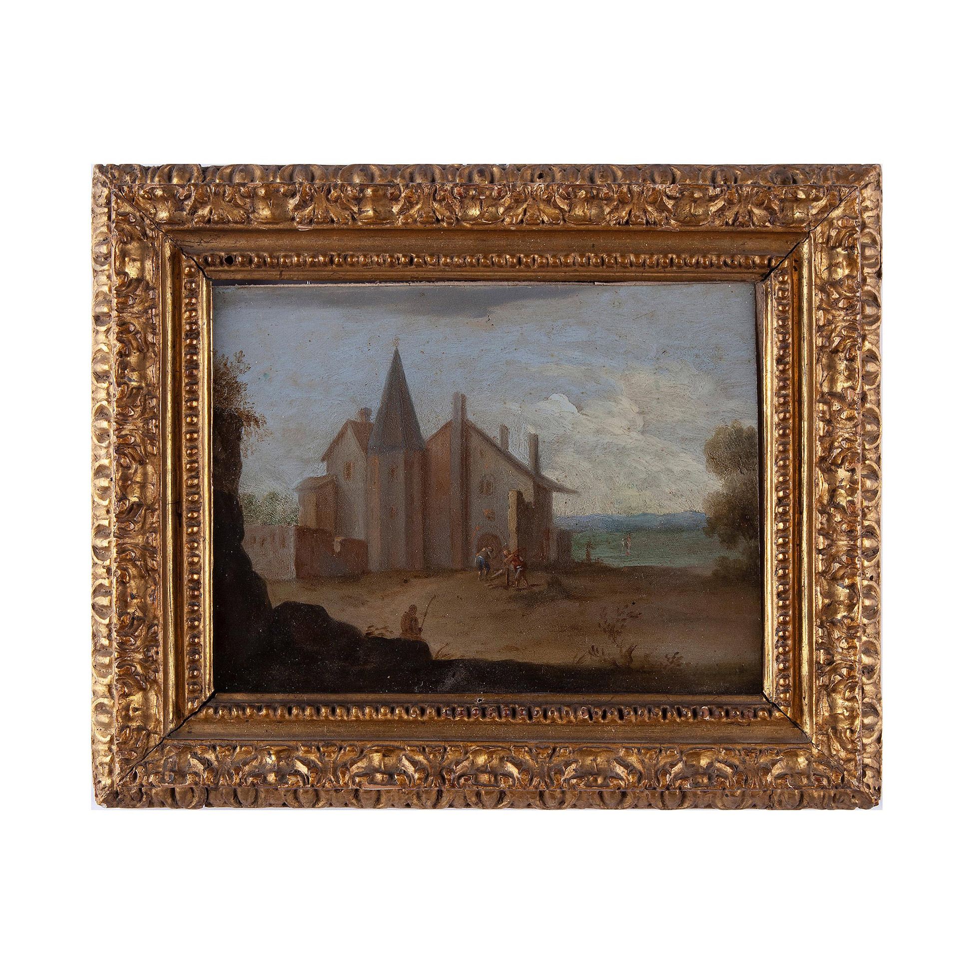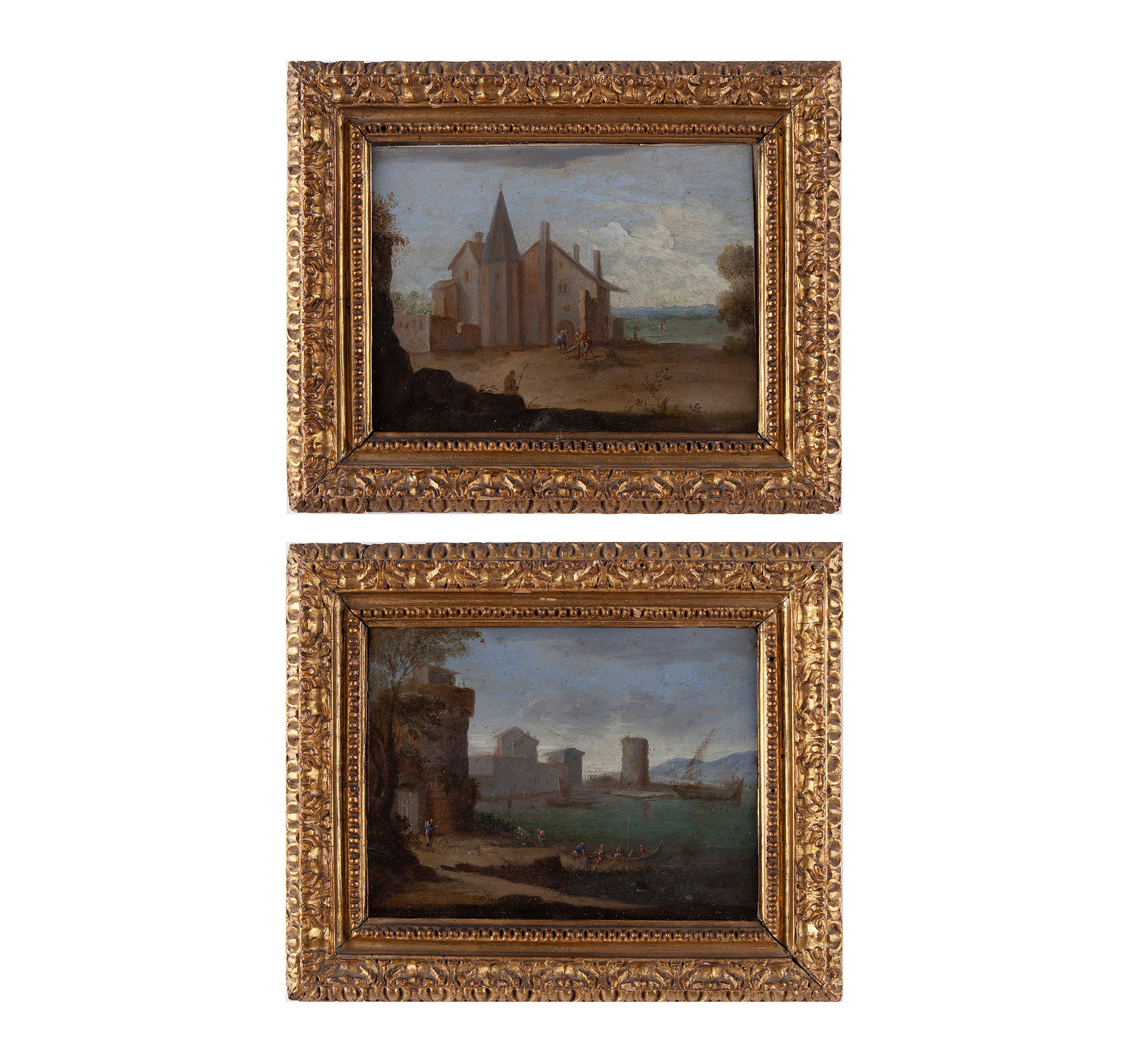 Pittore fiammingo della fine del XVII secolo, Coppia di paesaggi Pittore fiammingo della fine del XVII secolo, Coppia di paesaggi Olio su rame, con cornici dorate Olio su rame, dimensioni ext. 20,5x25, int. 13,5x17,4 cm. cad.