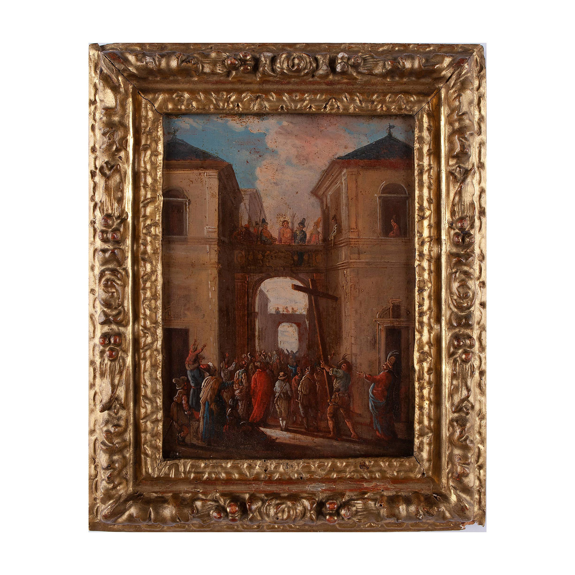 Pittore romano della prima metà del XVIII secolo, La condanna di Cristo Pittore romano della prima metà del XVIII secolo, La condanna di Cristo Olio su tavola, con cornice dorata Olio su tavola, dimensioni ext. 32x26, int. 22,5x17,5 cm.