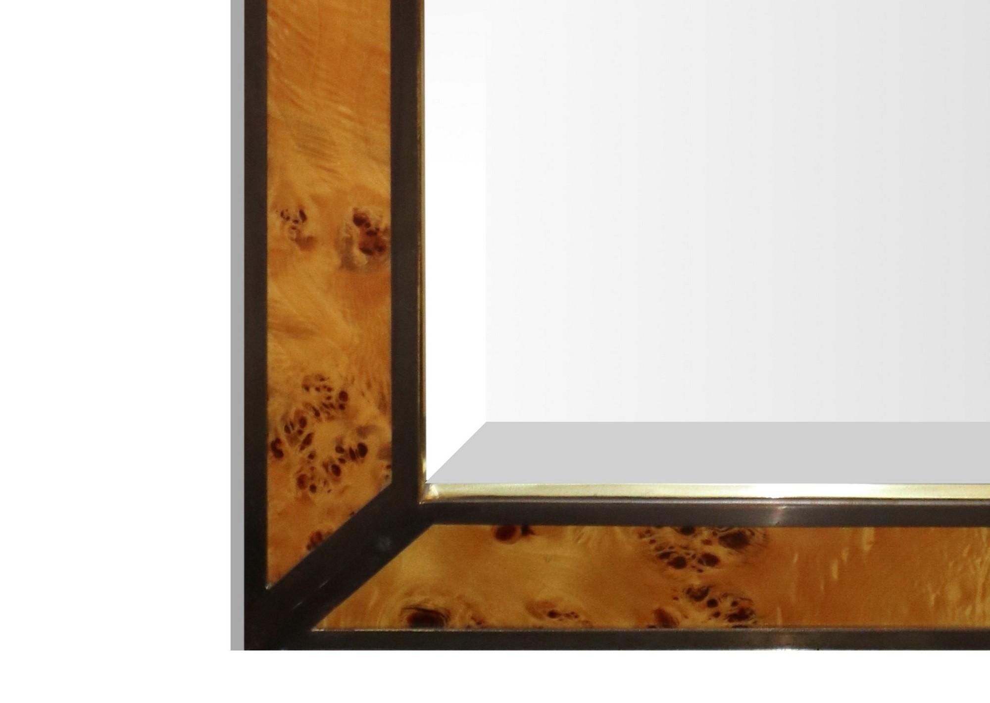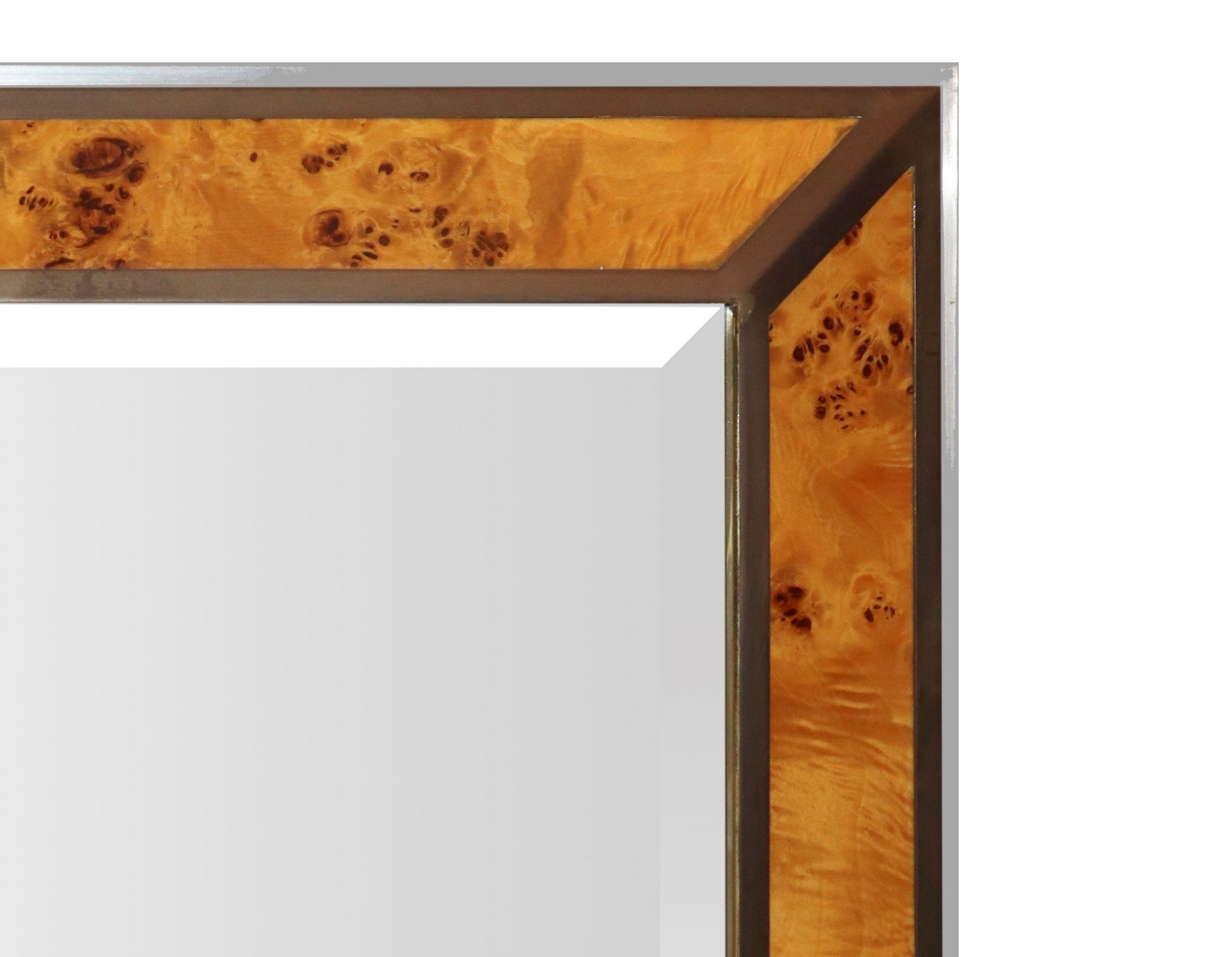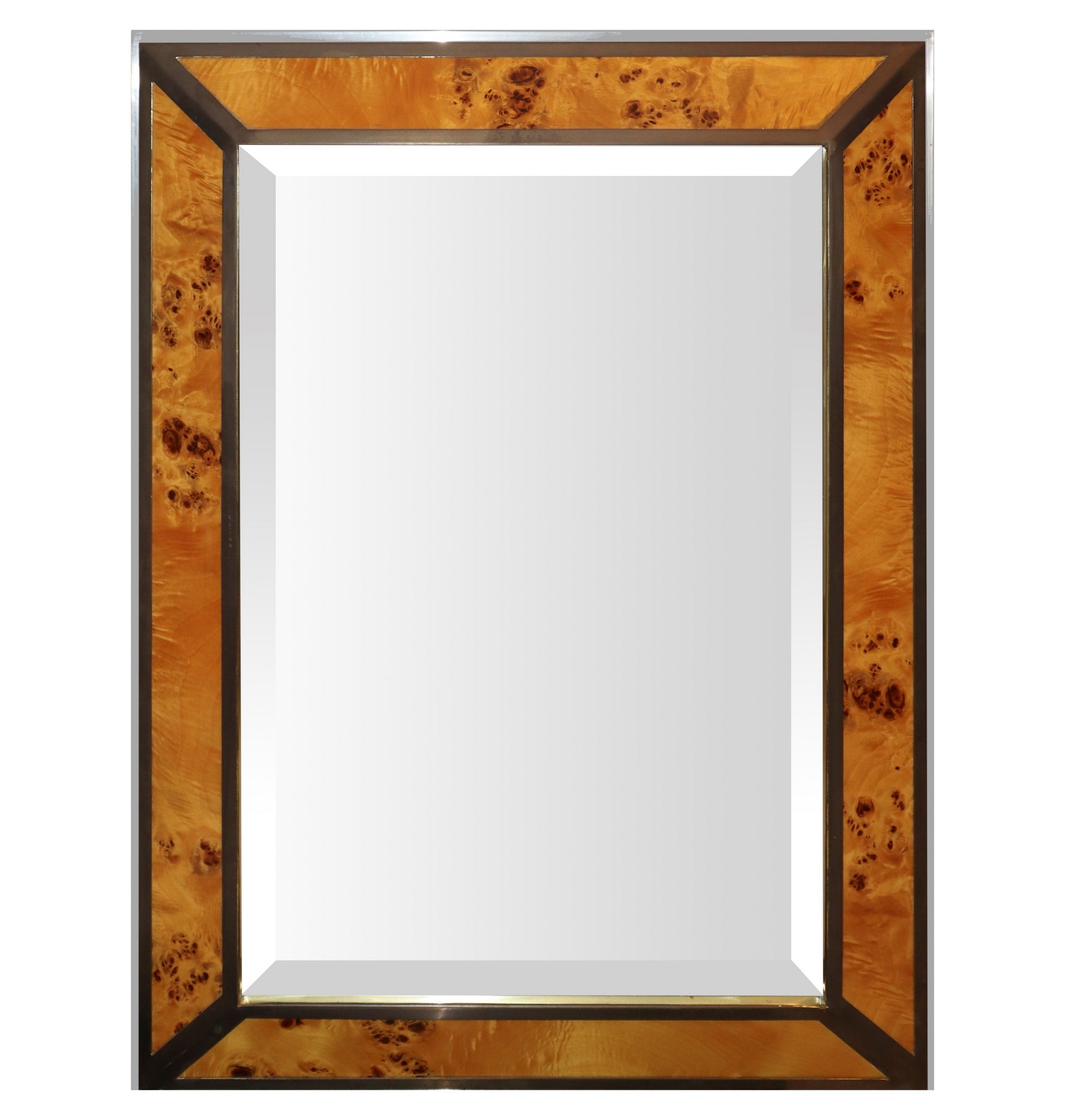 Specchiera rettangolare con struttura in metallo cromato, 70's cm 67 x cm 92 Produzione italiana nello stile di Willy Rizzo. Dettagli in ottone e radica di erica. Tracce di ossidazione segni di uso.