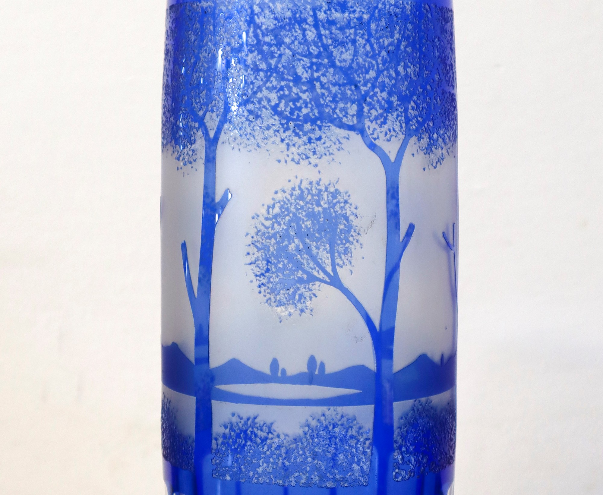 Vaso decò in vetro Bohemian, Wilhelm Kralik, 1920 H cm 30, base cm 10 Decorato all'acido con paesaggi ed alberi nei toni del blu